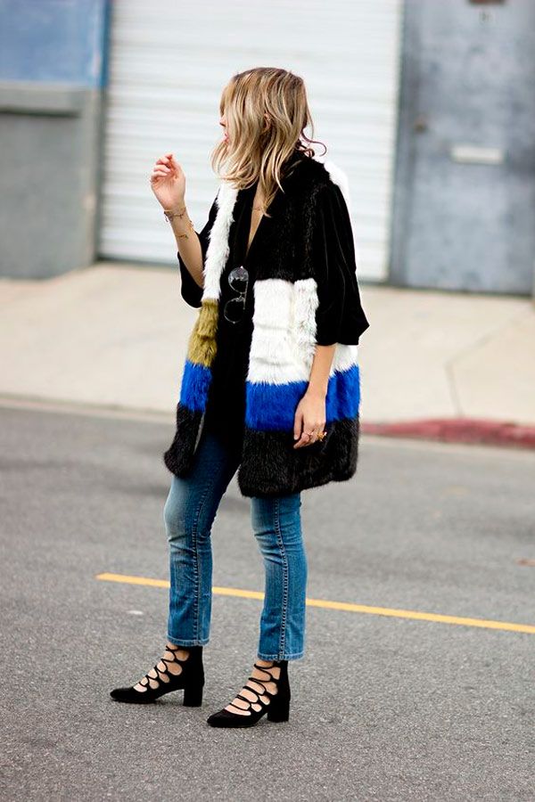 Look com calça jeans, camisa preta, maxi colete de pelos e sandália de salto.