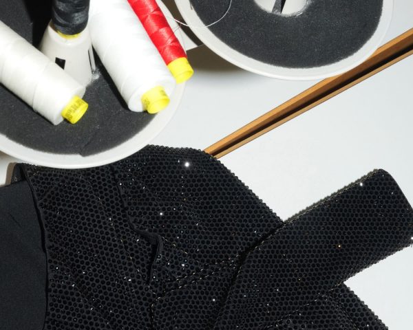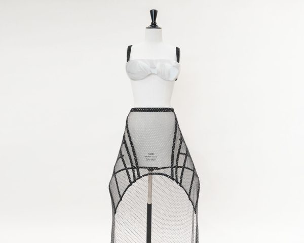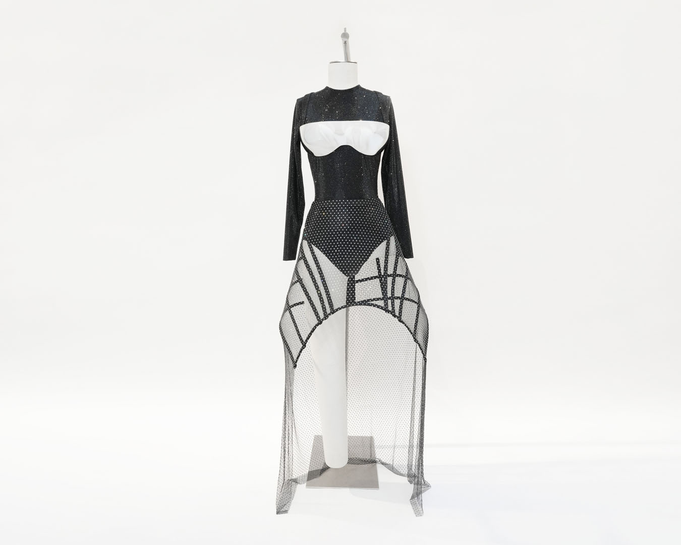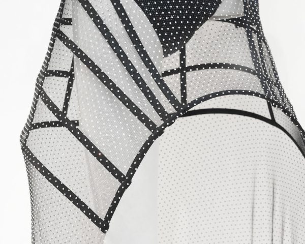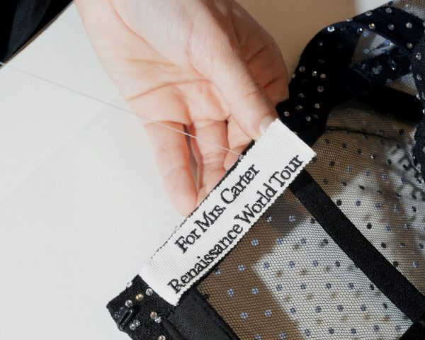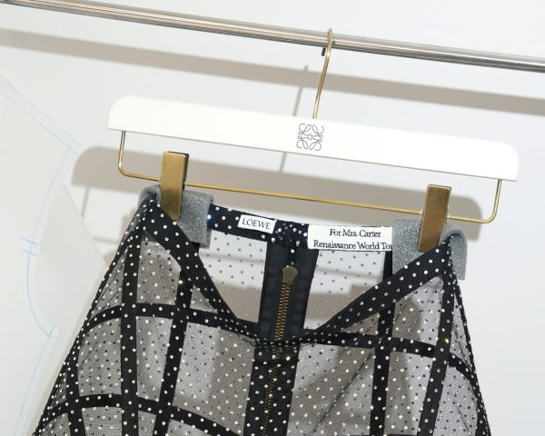 El look está compuesto de un body satinado con aplicaciones de cristales de Swarovski negros, una falda de rejilla de tul con adornos de cristales plateados, y un sujetador de piel con estampado 3D, en acabado cromado plateado. Como complemento, unas gafas de sol de máscara ondulada con un anagrama en el brazo. Simplemente, Beyoncé.