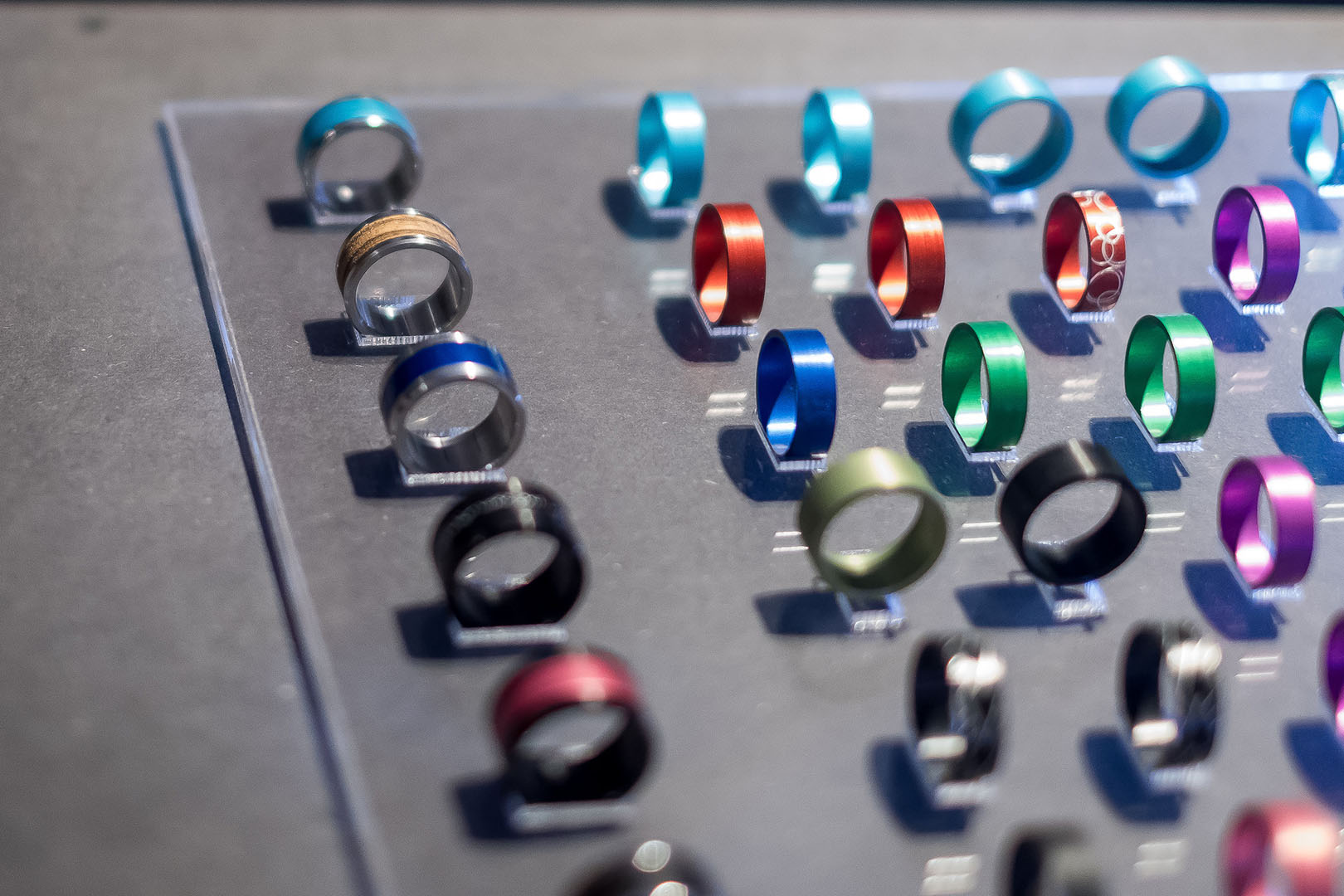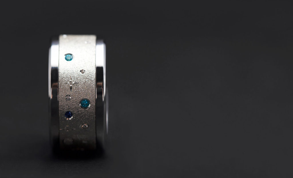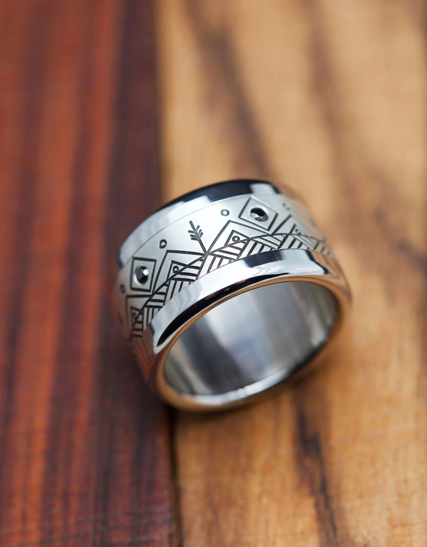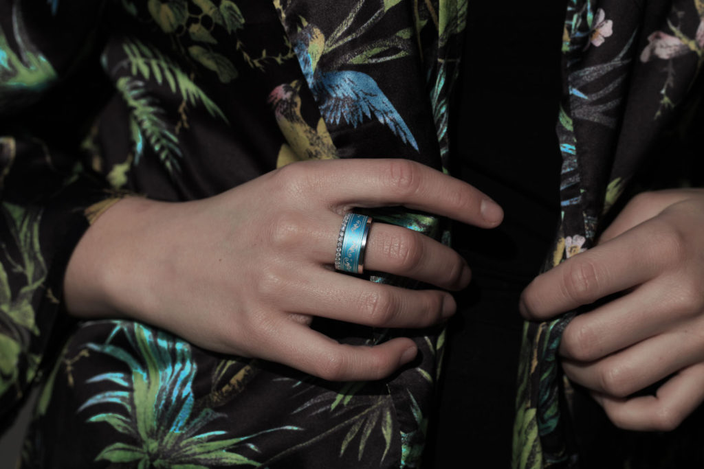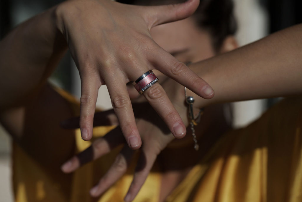 Un innovador sistema permite cambiar la estética del anillo siempre que se quiera con total libertad. La estructura de acero que conforma la base se divide en dos elementos separables entre los cuales se coloca el anillo central, disponible en diversos materiales: acero, acetato, oro rosado, paladio, carbono, madera, tantalio o plata, entre otros. La fuerza del acero y la elegancia del resto de materiales se dan la mano en una mezcla moderna y transgresora. Un anillo unisex, perfecto tanto para hombres como mujeres, que permite dotar la pieza de un toque masculino o femenino según la combinación escogida.