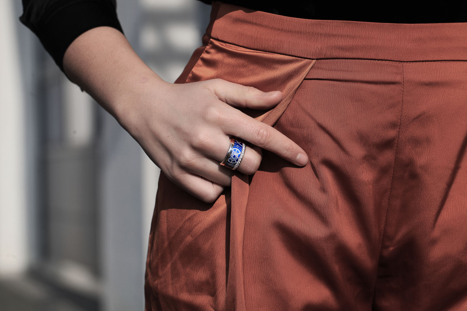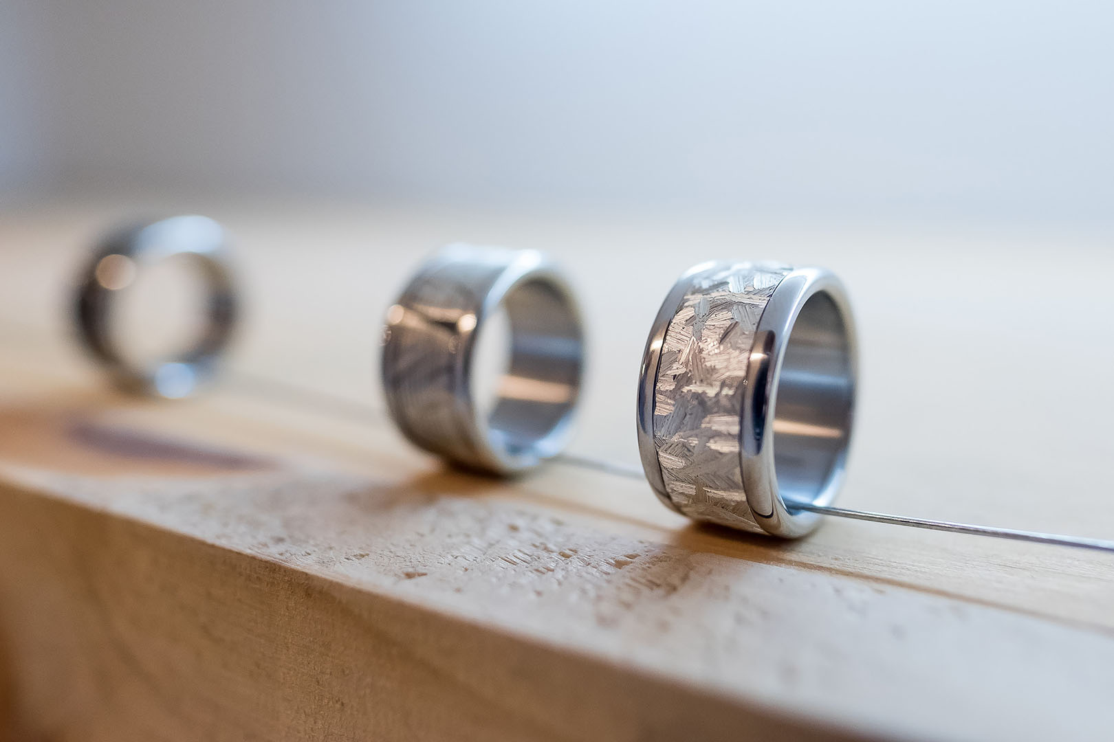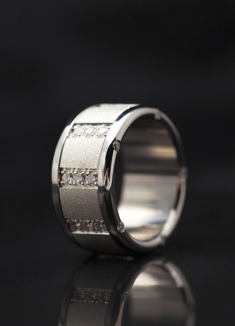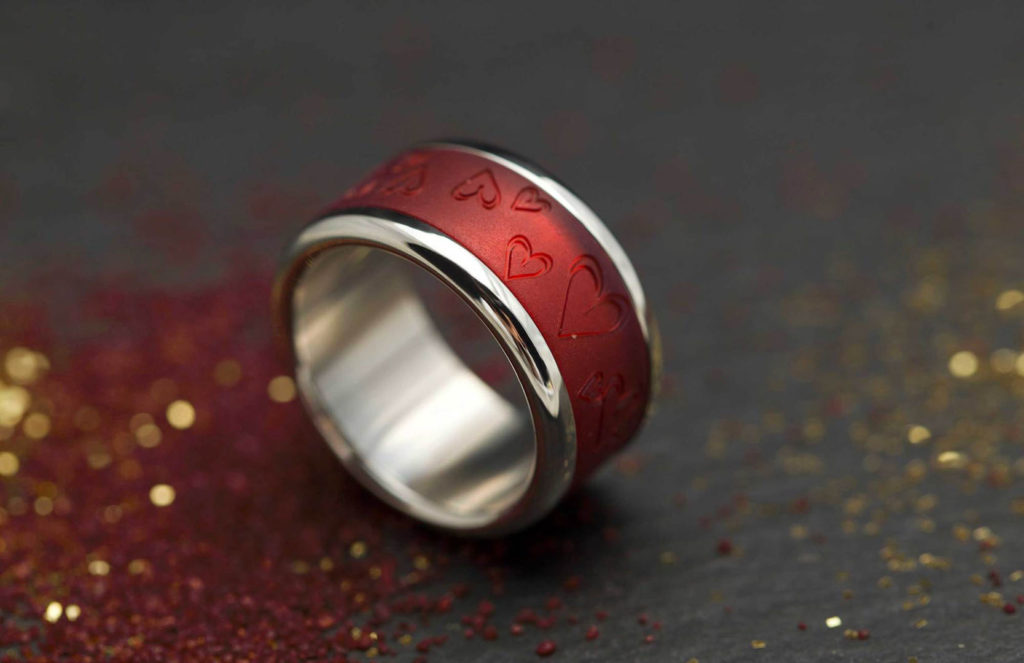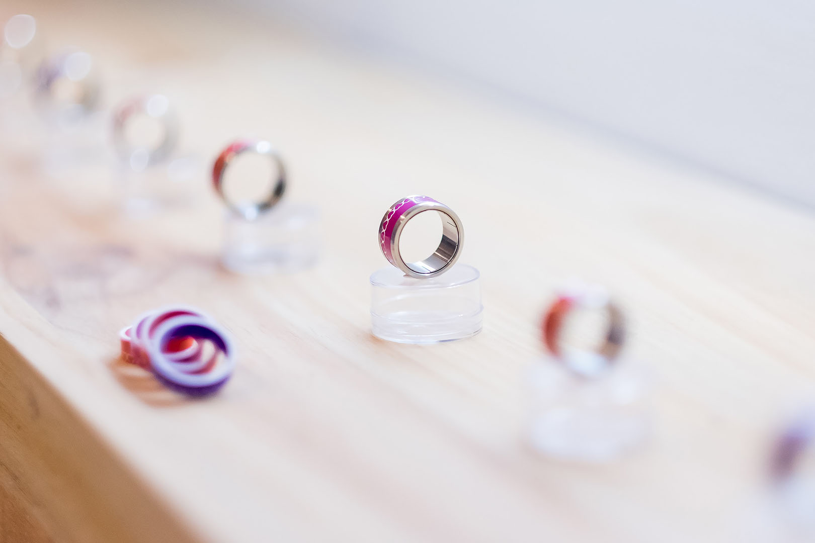 Un innovador sistema permite cambiar la estética del anillo siempre que se quiera con total libertad. La estructura de acero que conforma la base se divide en dos elementos separables entre los cuales se coloca el anillo central, disponible en diversos materiales: acero, acetato, oro rosado, paladio, carbono, madera, tantalio o plata, entre otros. La fuerza del acero y la elegancia del resto de materiales se dan la mano en una mezcla moderna y transgresora. Un anillo unisex, perfecto tanto para hombres como mujeres, que permite dotar la pieza de un toque masculino o femenino según la combinación escogida.