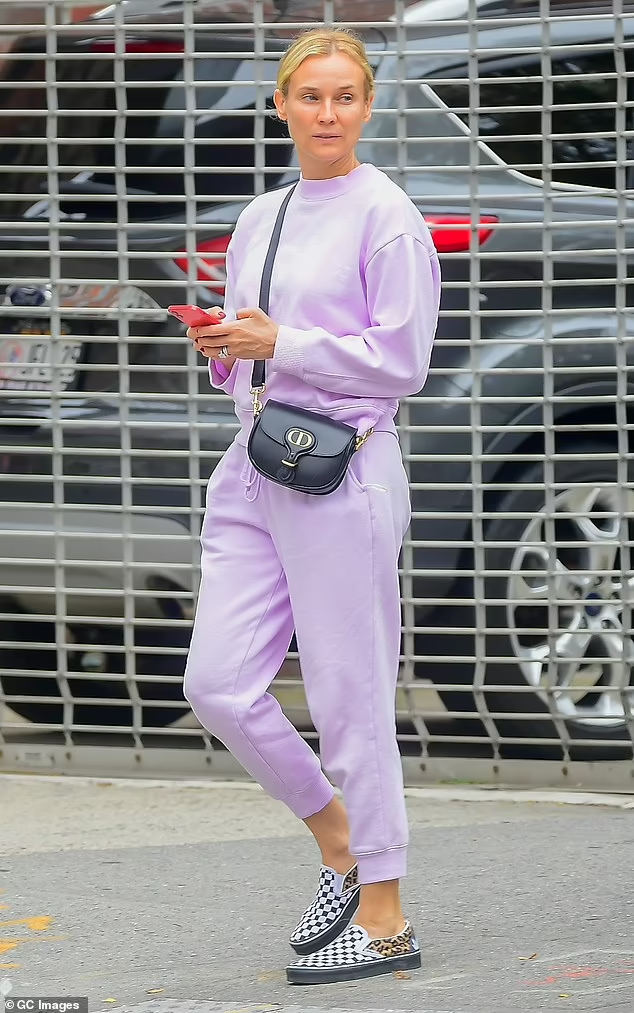 Diane Kruger clings to phone as she dresses down in a lilac sweatsuit