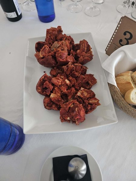Con una copa de sus vinos, la mayoría de ellos premiados en los diferentes certámenes dedicados al mundo del vinos fuimos disfrutando de aperitivo, también propio del Bierzo; pimiento asado, queso y cecina.