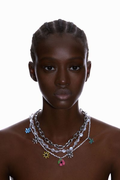 La colección Toilette incluye collares de perlas irregulares -un must-have de cualquier joyero juvenil que se precie- cadenas metálicas y una nutrida panoplia de flores con cromáticas primaverales, las protagonistas este nuevo drop. |