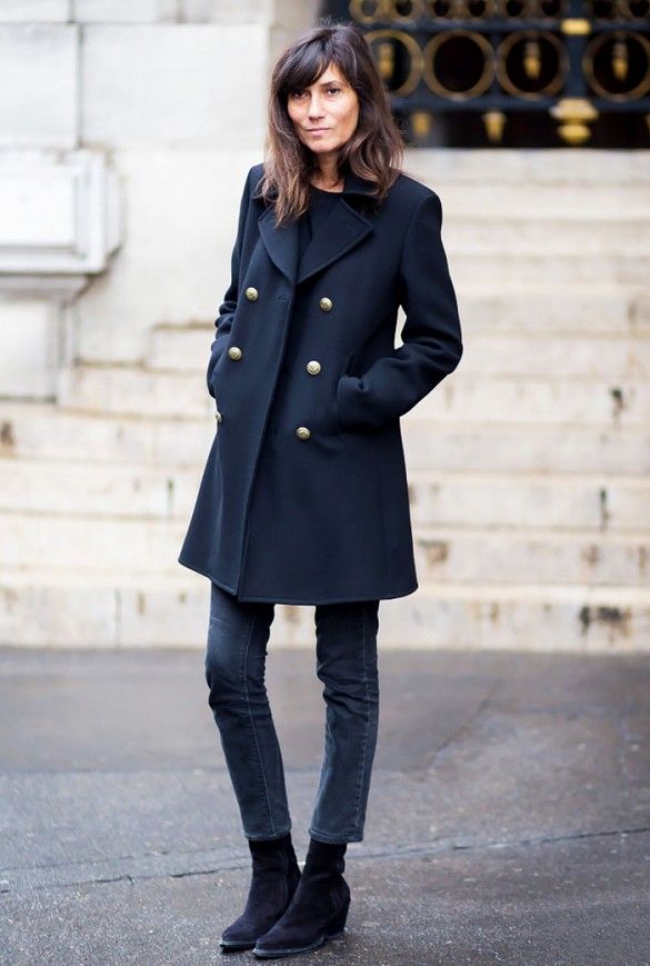 A pair of sleek black ankle boots, a cropped skinny jean, and a classic peacoat.