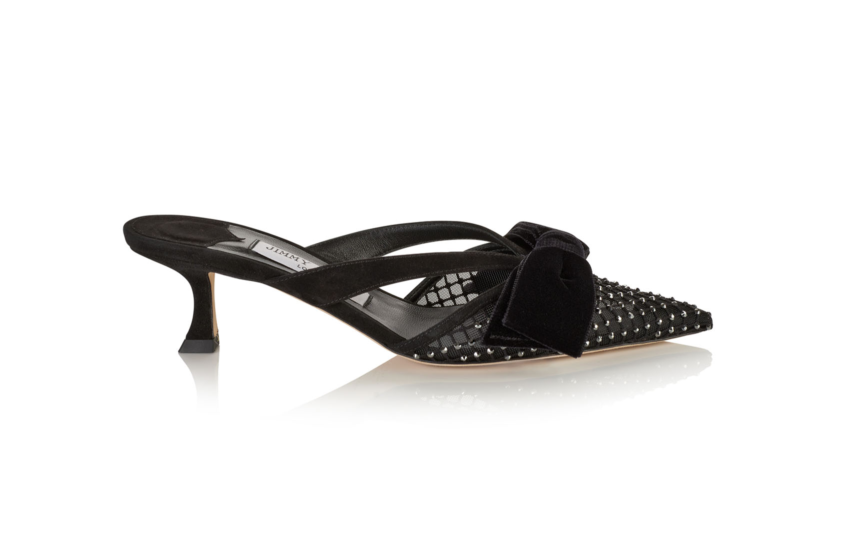 Inicio Jimmy Choo presenta la nueva colección de invierno 2022 FLACA MULE 50 - CRYSTAL MESH W VELVET BOW SUEDE - BLACK HEMATITE