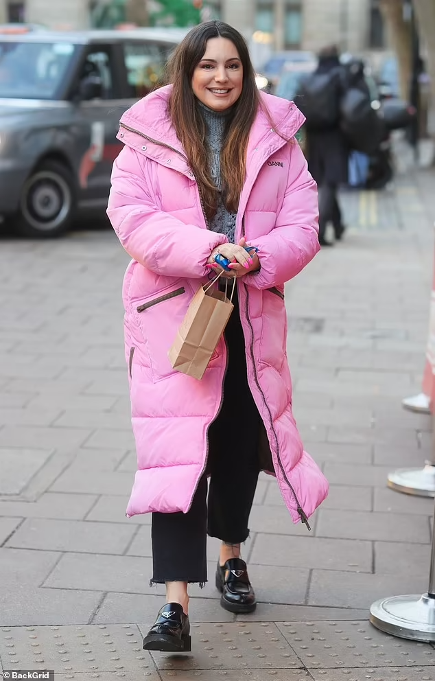 Kelly Brook wears a playful pink coat and Prada loafers to Heart Radio
