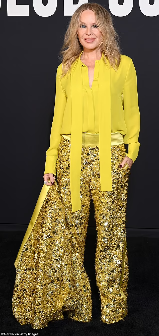 Kylie Minogue amps up the glamour in a yellow blouse and glitzy trouser suit | Daily Mail Online