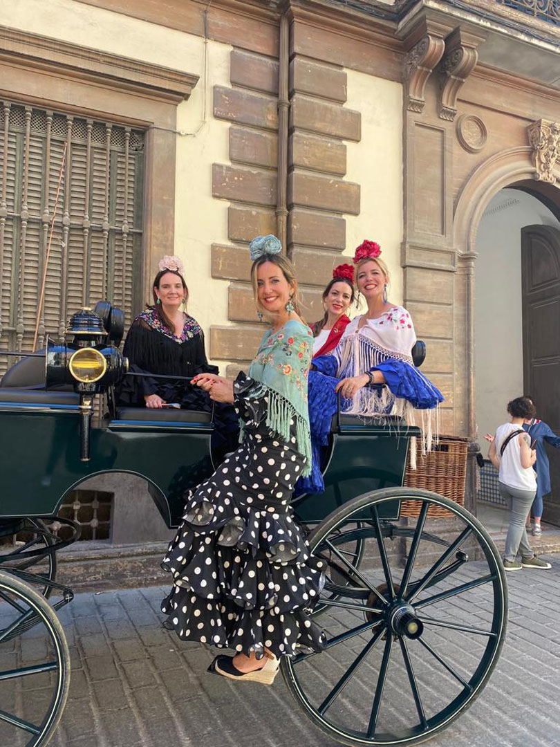 La arquitecta de Estudio en Blanco, Arantxa Pérez Pous y sus amigas Paula Bernal, procuradora de los Tribunales; Elena Ravello, directora de marketing y comunicación en Marie Claire y Ana Parejo, han paseado guapísimas por el Real de la Feria de Sevilla luciendo sus preciosos trajes de flamenca.