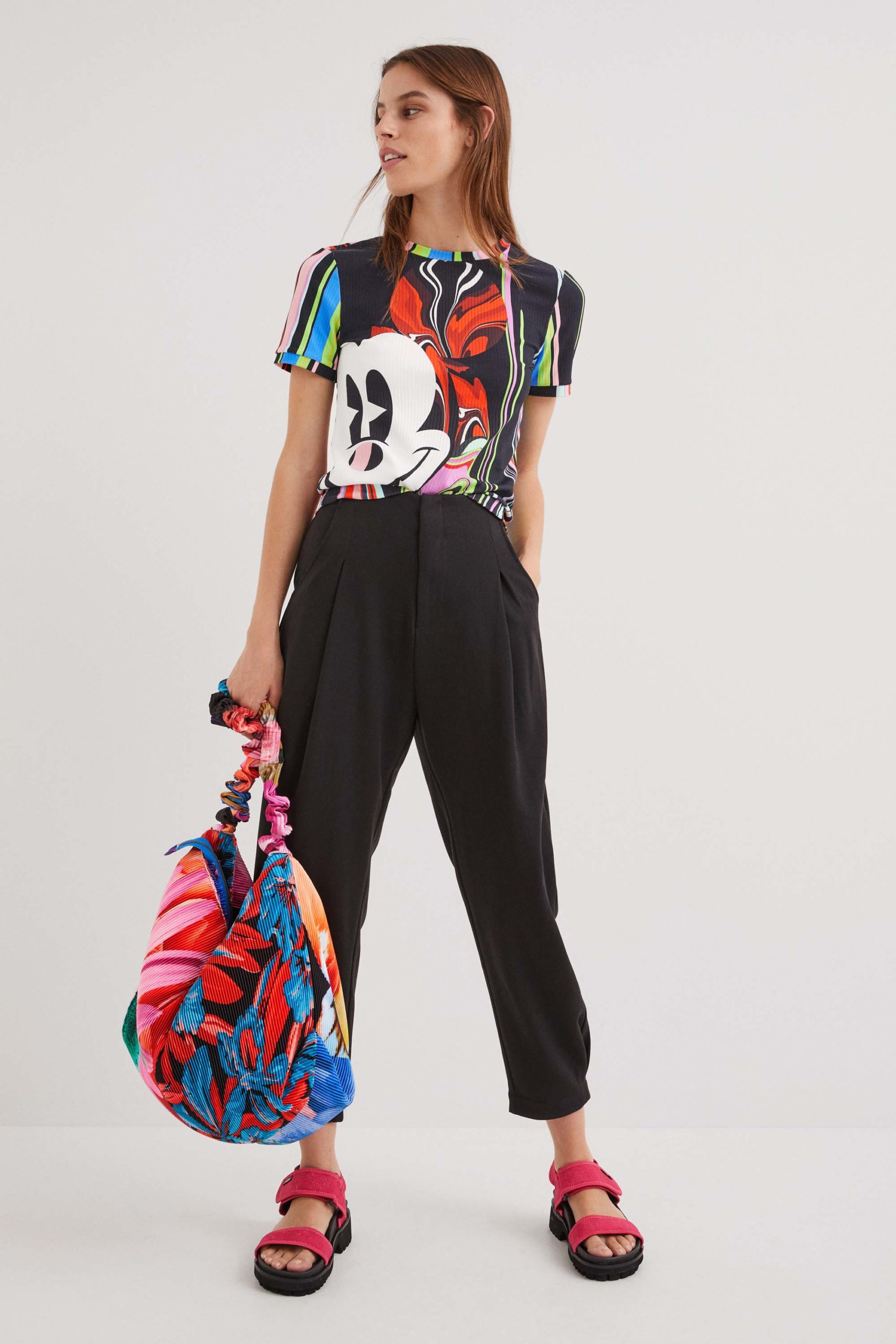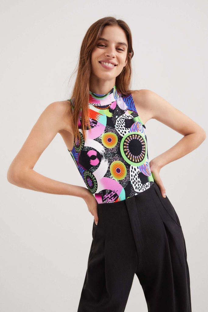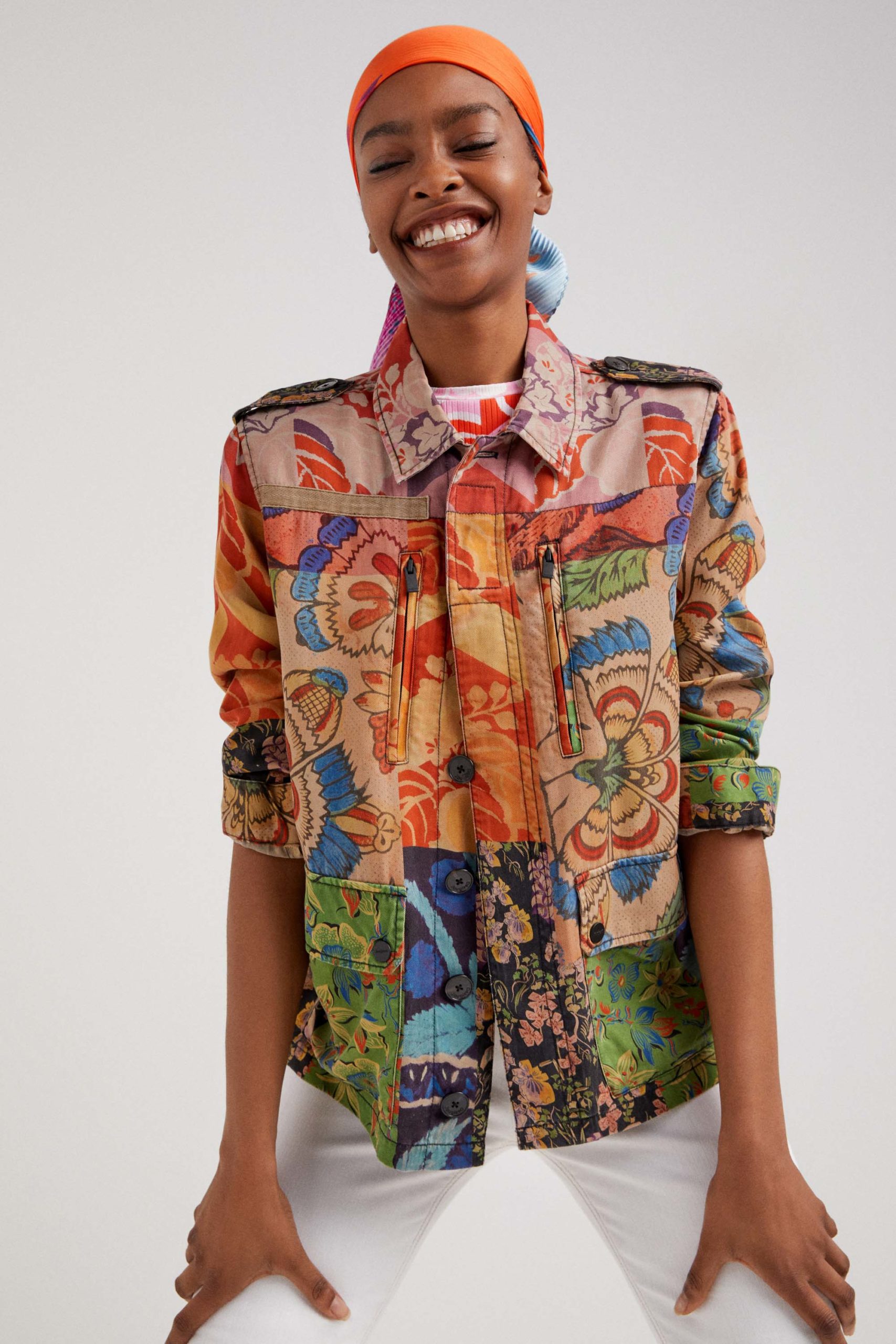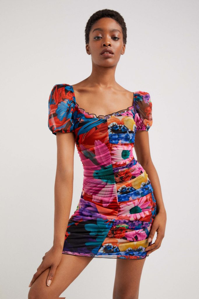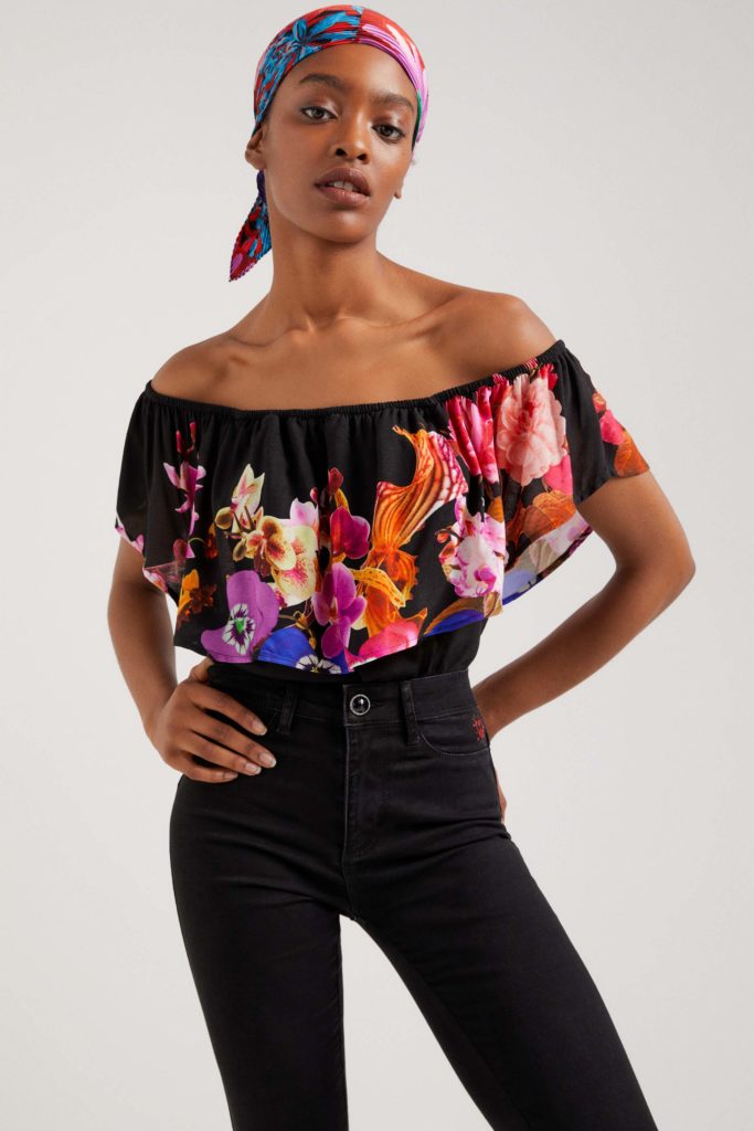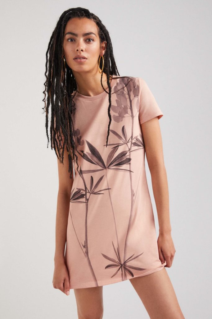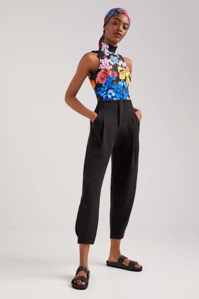 Una evolución del mismo print la encontramos en combos estrella de la colección como una camiseta elástica con falda a conjunto, con una marcada reminiscencia años 2000. Otras piezas de la cápsula -una chaqueta, un jersey ligero, una blusa, un vestido camisero, un mono, pañuelos, bolsos…- presentan el mismo motivo. En contraste con el resto de prendas florales de la cápsula quedan genial.