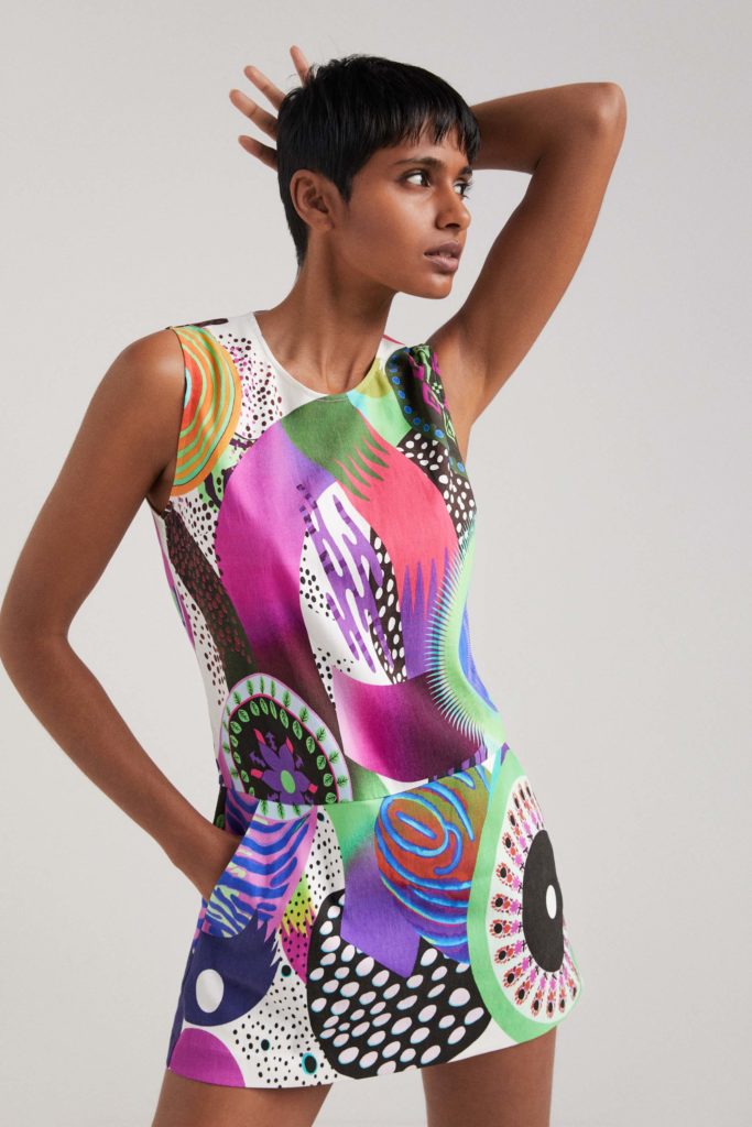 El resto de la cápsula incluye preciosos estampados caleidoscópicos, inspirados en las orquídeas; flores maximizadas en escalas enormes; motivos botánicos bicolor, más serenos; y una reinterpretación en clave abstracta que transforma las flores en formas abstractas, cuasi galácticas.