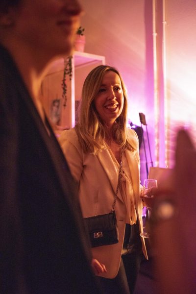 A la llegada a la fiesta los recibió Liz Dust con una copa de champagne, y haciendo gala de su rapidez y humor, hizo las delicias de los que llegaban.