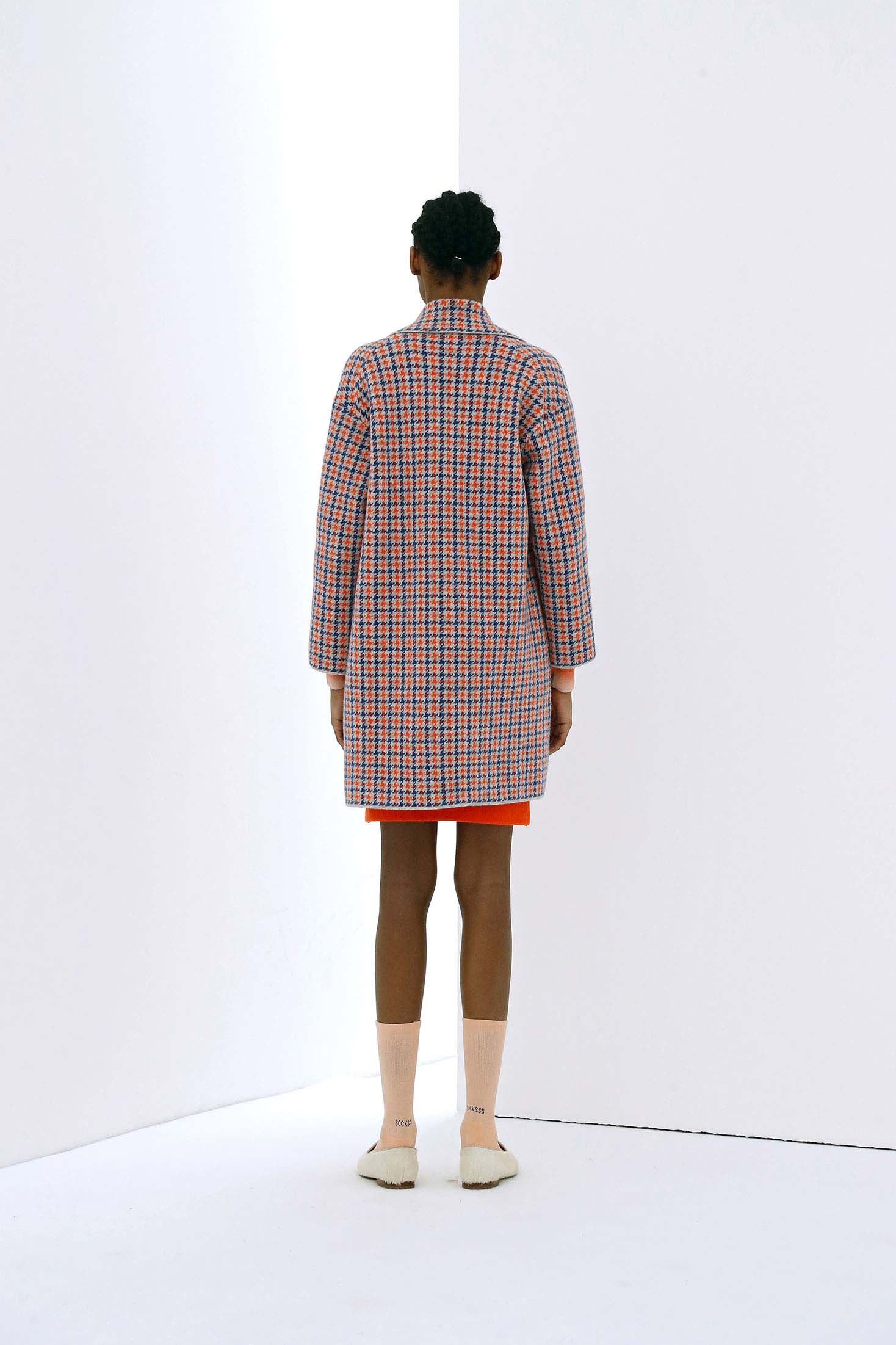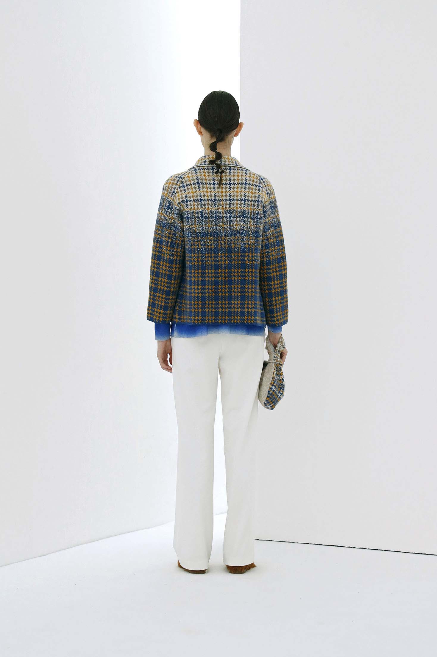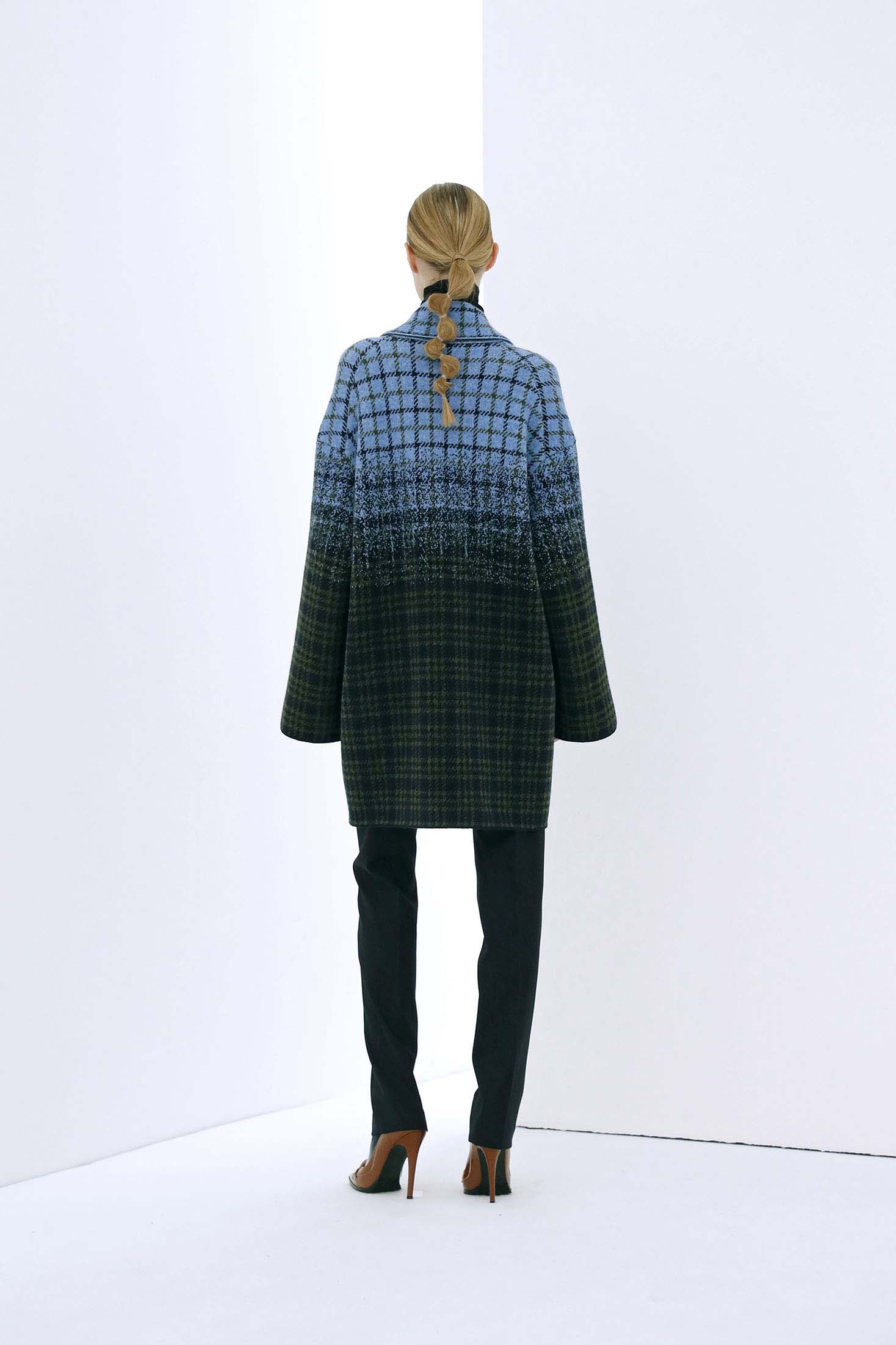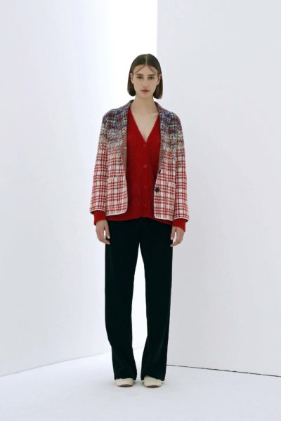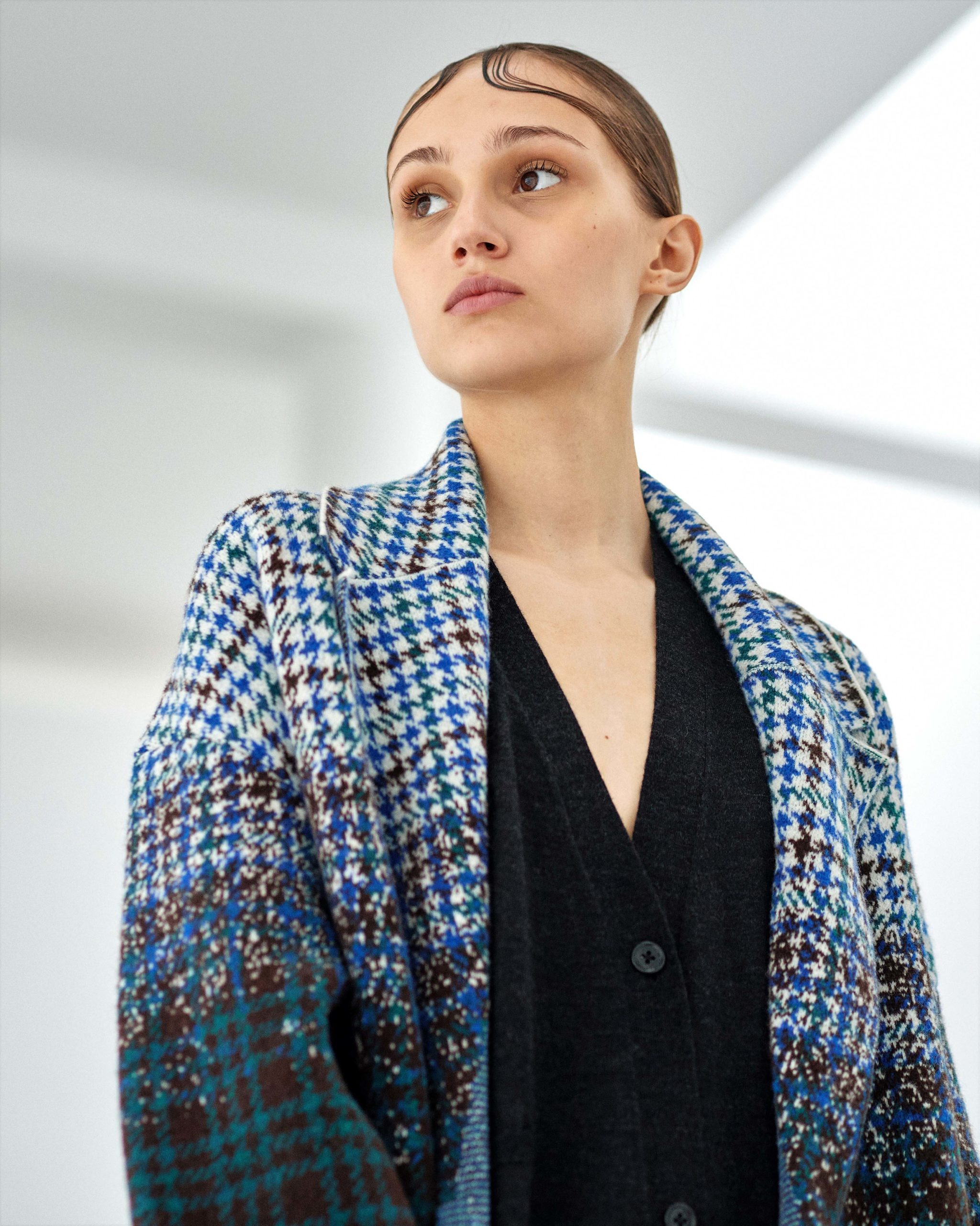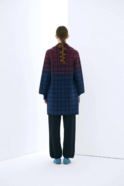 En Aurora OI22/23 encontraréis abrigos, chaquetones y chaquetas petit  en  lana  y alpaca con jacquard de cuadros, pata de gallo y de fantasía, siempre con mucho color retomando la inspiración de las luces brillantes de las auroras boreales. En esta línea, una serie de jerséis básicos lisos y con pequeñas trenzas 100% lana en un corte básico y en clave crop que aportan una alternativa muy versátil.