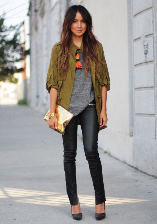 Look de moda: Chaqueta militar verde oliva, Camiseta con cuello circular gris, Pantalones pitillo de cuero negros, Zapatos de tacón de ante negros