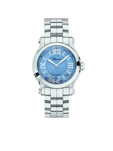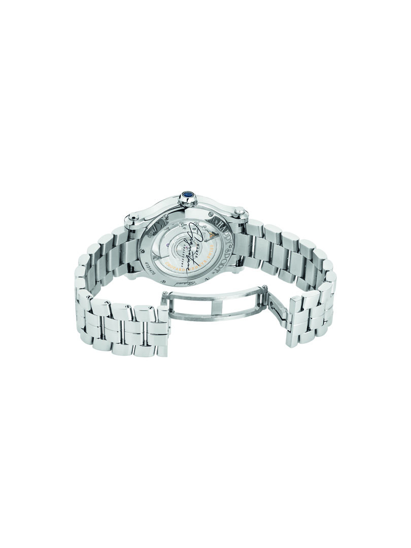 Aunque se hayan lanzado numerosas variantes, la Happy Sport Signature Collection es única. Acorde al actual estilo retro de los 90 y la esfera en azul hielo con decoración con efecto de rayos de sol y un centro grabado, cuatro diamantes blancos y tres zafiros azul regio giran a través del tiempo. Alegre por naturaleza y deportivo en su esencia, este informal reloj de acero fino y de 36 milímetros de diámetro conjunta tanto con zapatillas como con tacones, vaqueros y trajes de oficina o vestidos de fiesta. En su corazón late un movimiento automático de precisión con indicación de la fecha. La reserva de marcha de 42 horas, junto con la agradable comodidad al llevarlo, es una promesa más a su portadora.