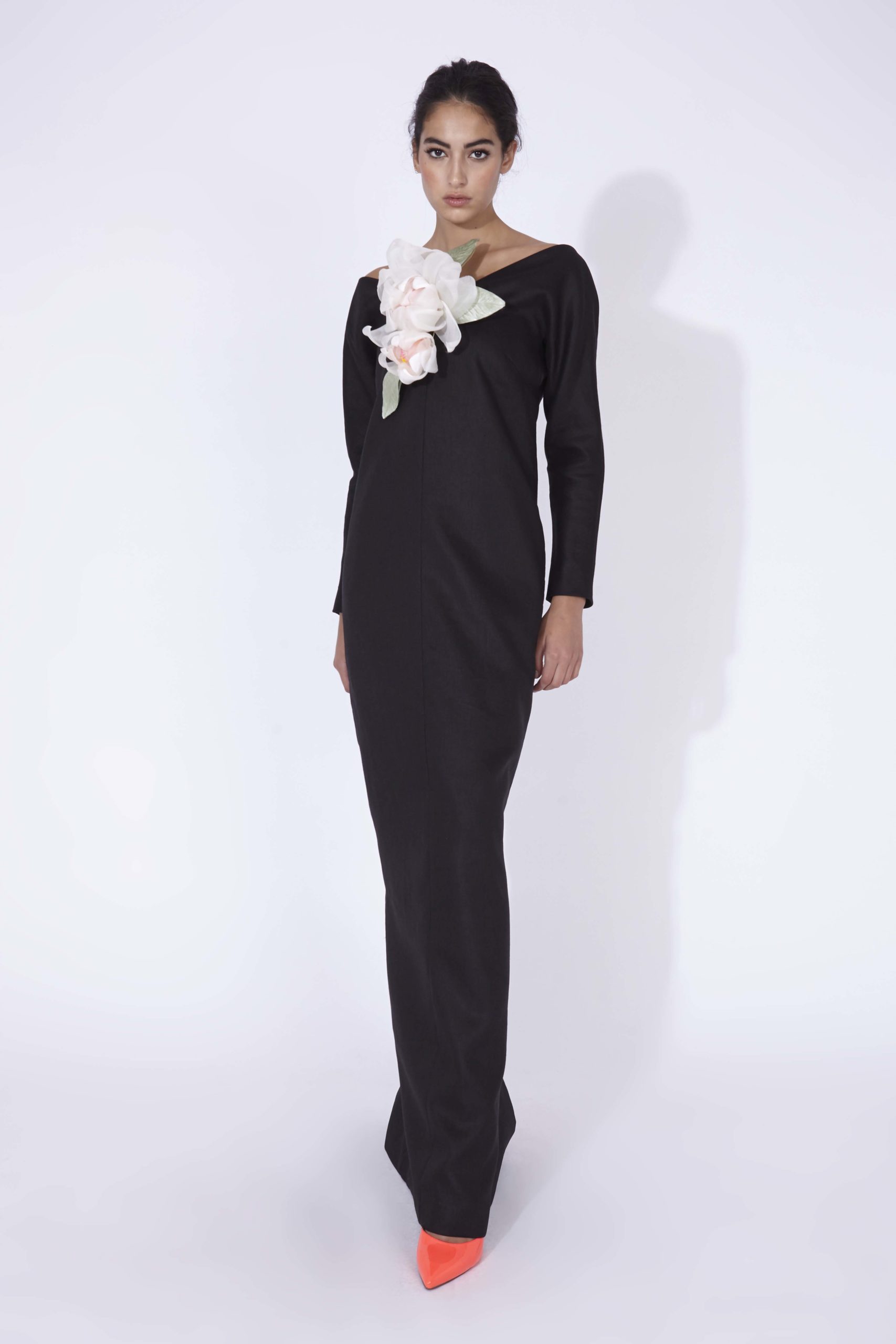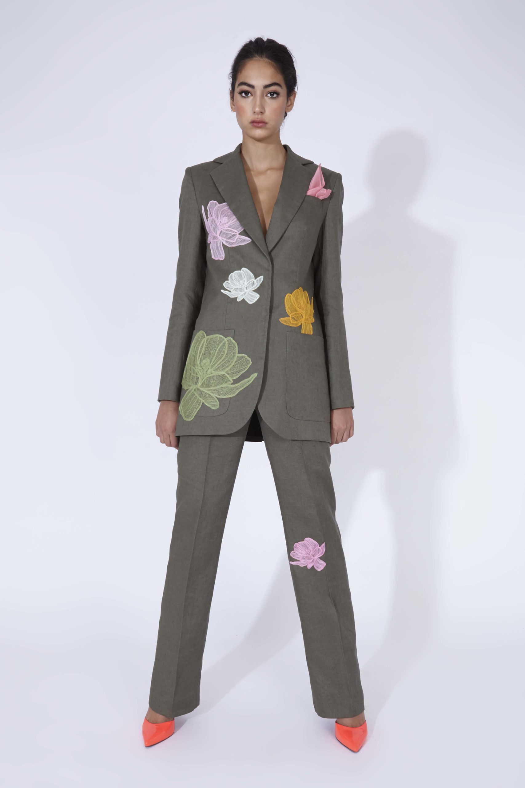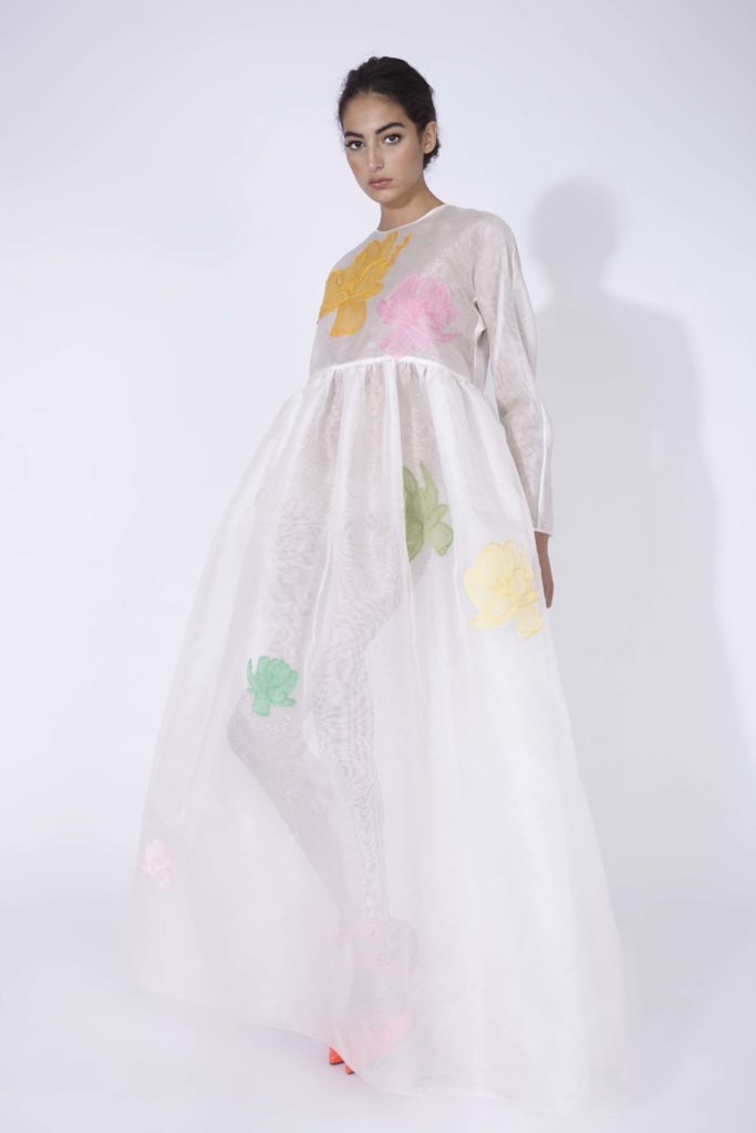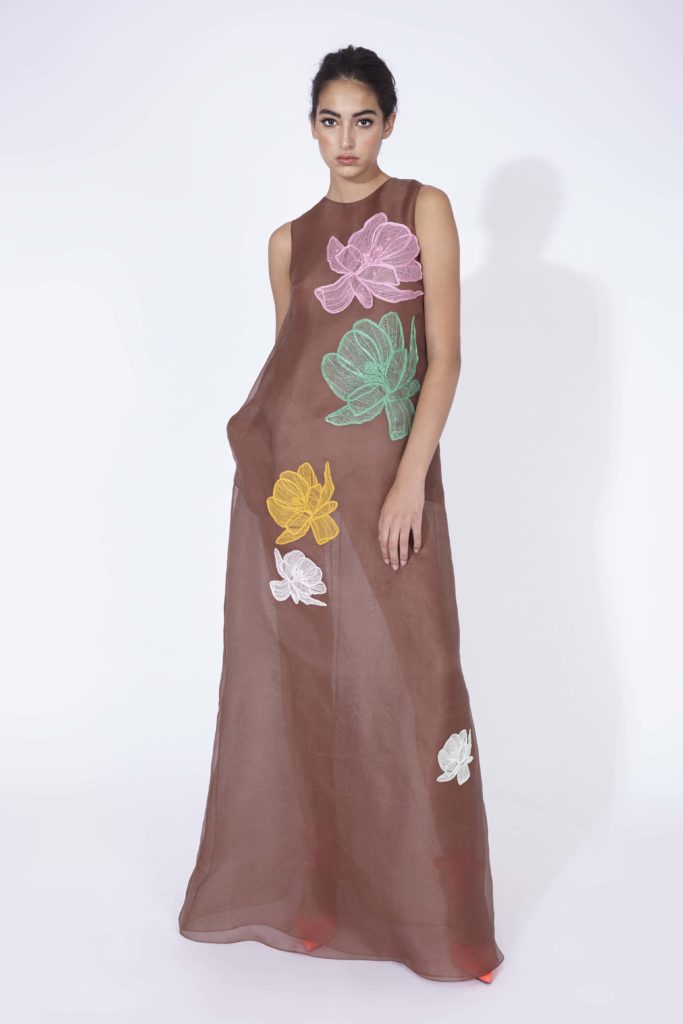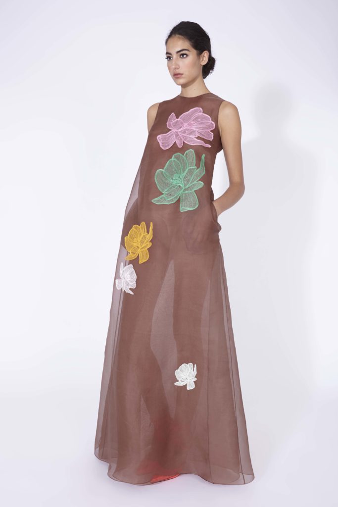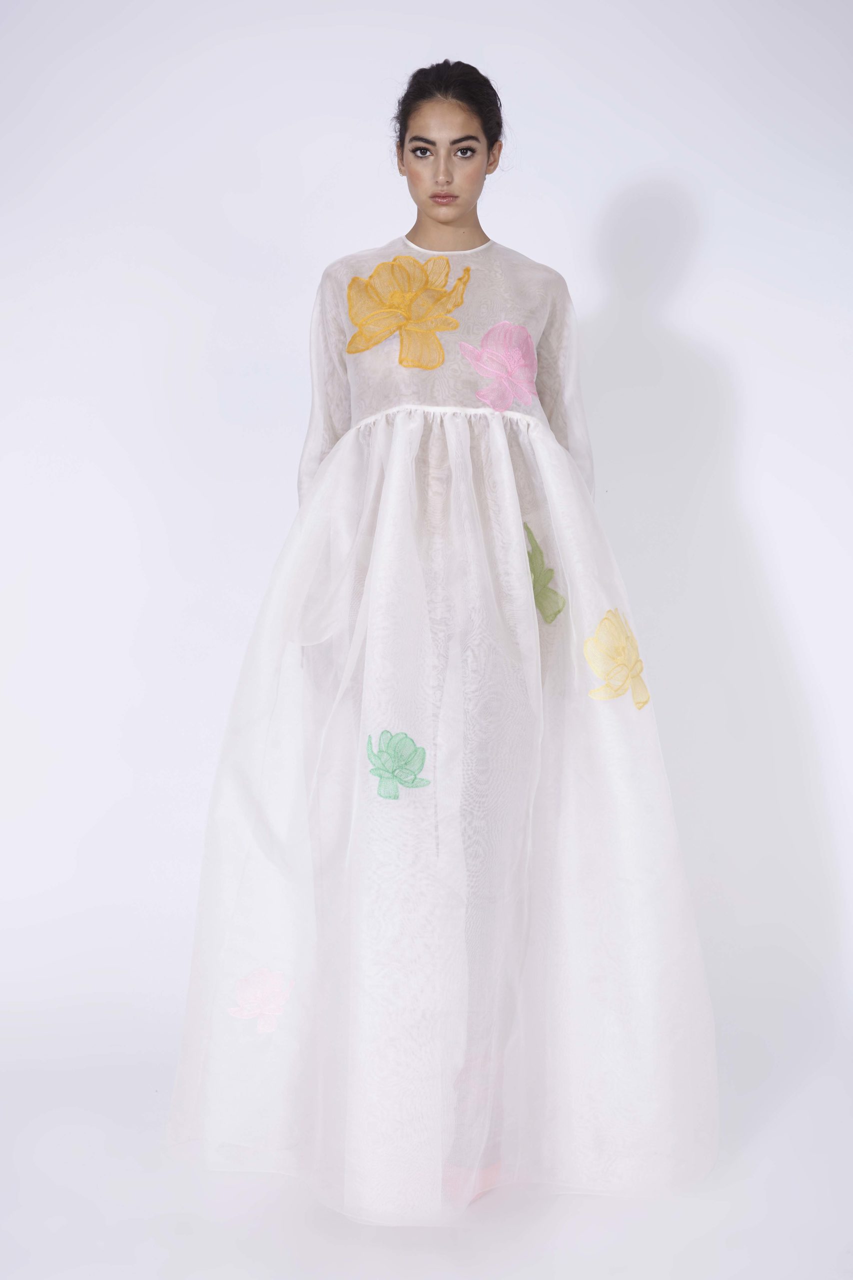 El hilo conductor de la colección viene de la mano de la interpretación de esta figura floral. Destacar como elementos más representativos las importantes magnolias multicolor en encaje, aplicadas a mano sobre diferentes tejidos de la colección, pintadas de forma artesanal, o bordadas en tul con marcados trazos que simulan la silueta de la flor.