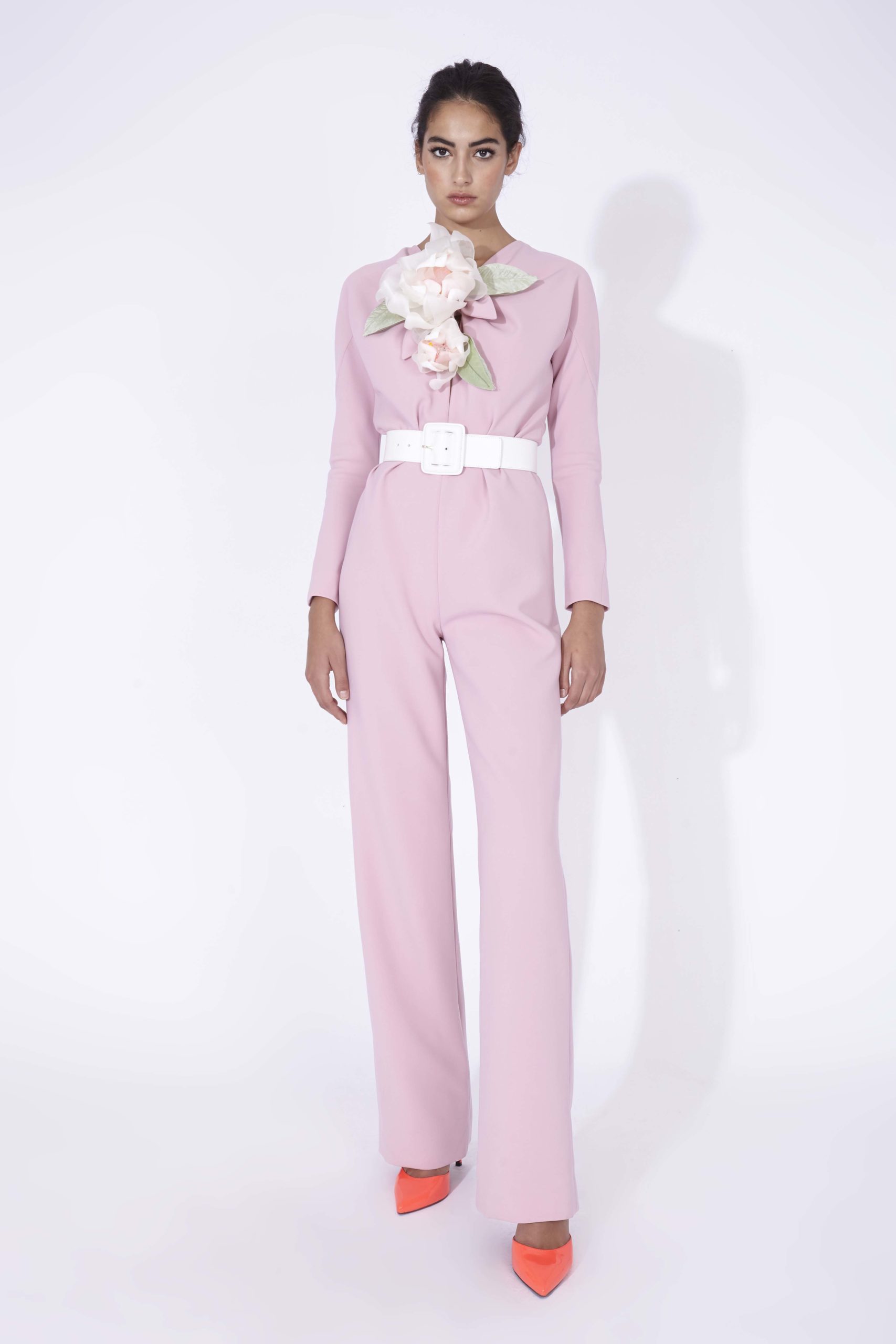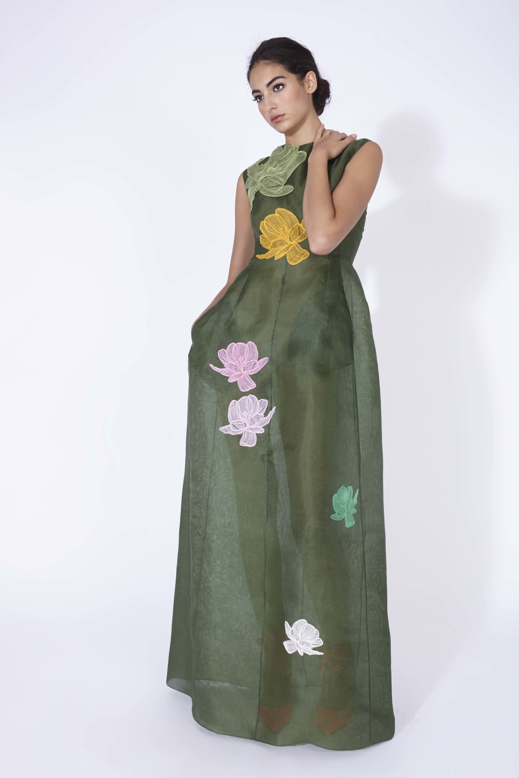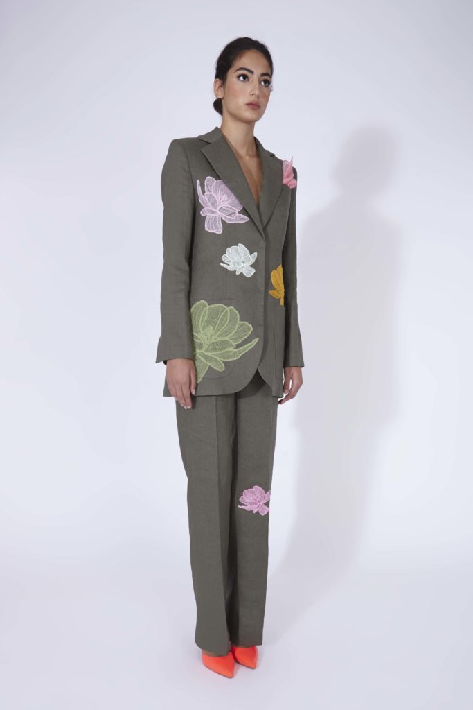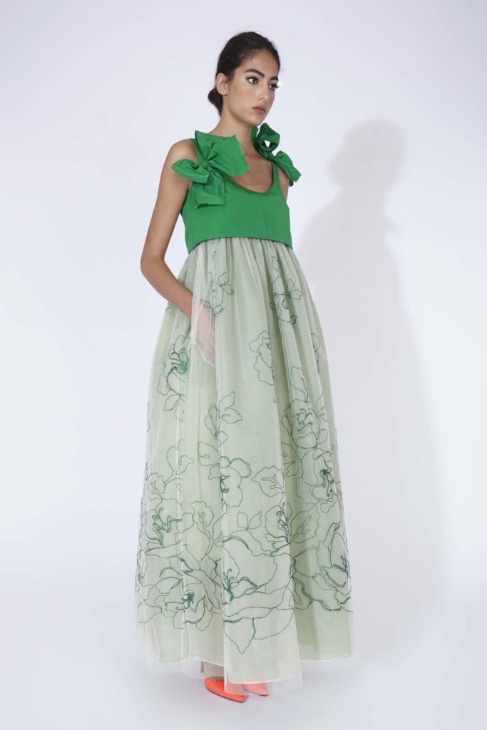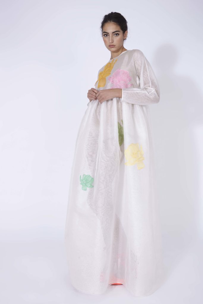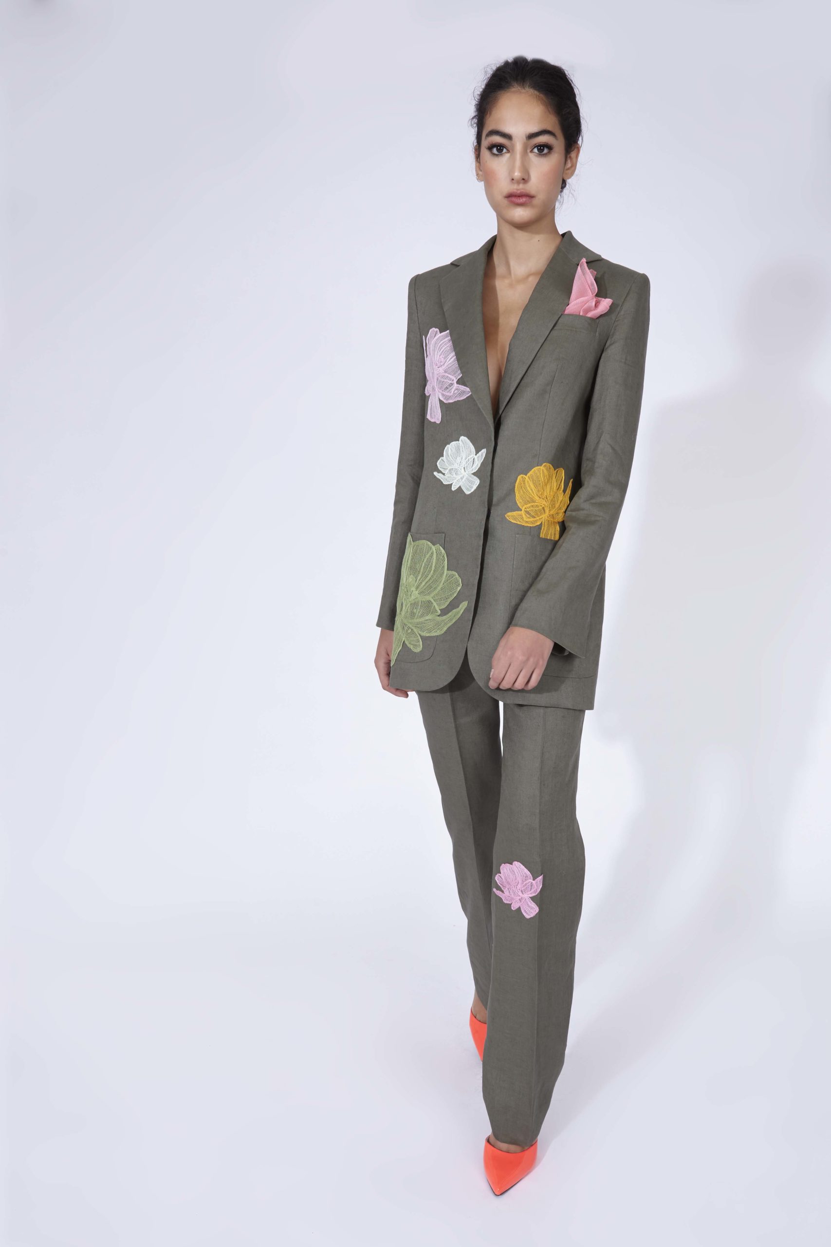 El hilo conductor de la colección viene de la mano de la interpretación de esta figura floral. Destacar como elementos más representativos las importantes magnolias multicolor en encaje, aplicadas a mano sobre diferentes tejidos de la colección, pintadas de forma artesanal, o bordadas en tul con marcados trazos que simulan la silueta de la flor.