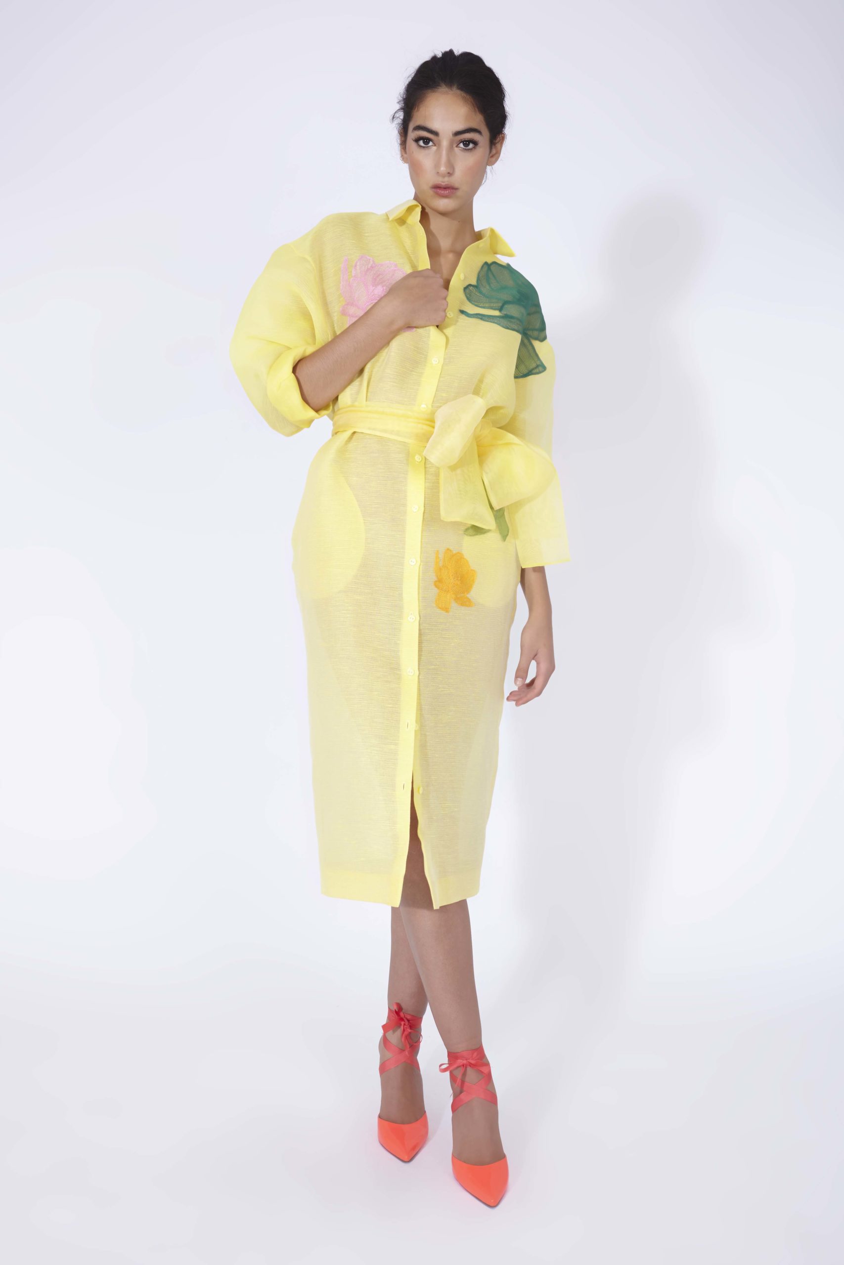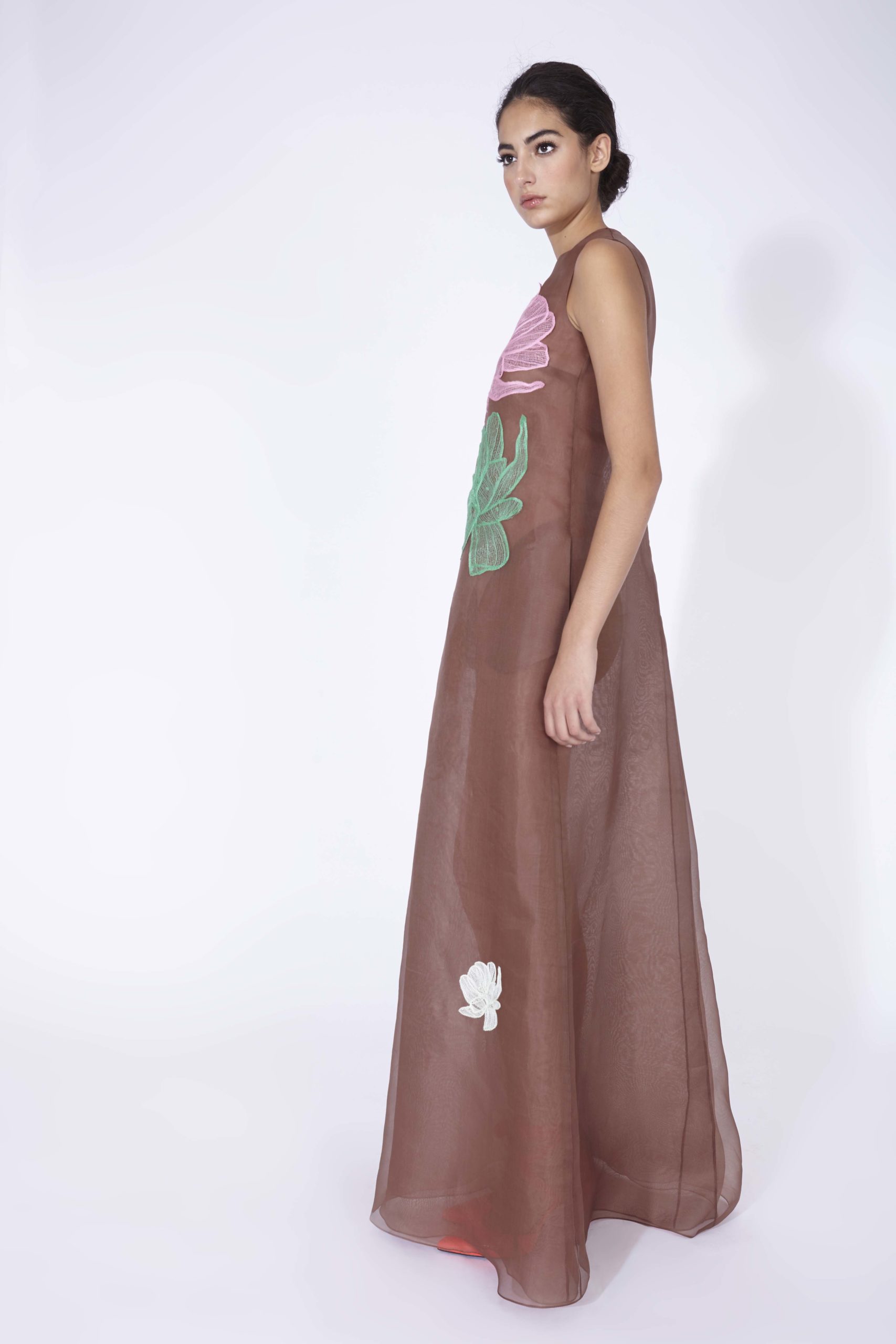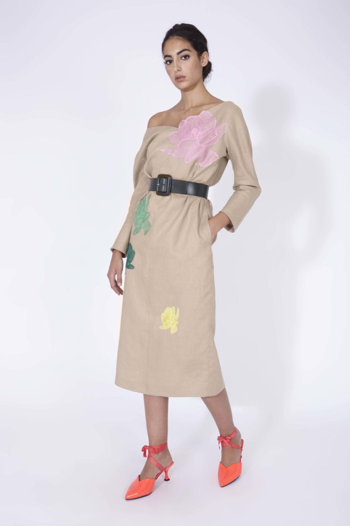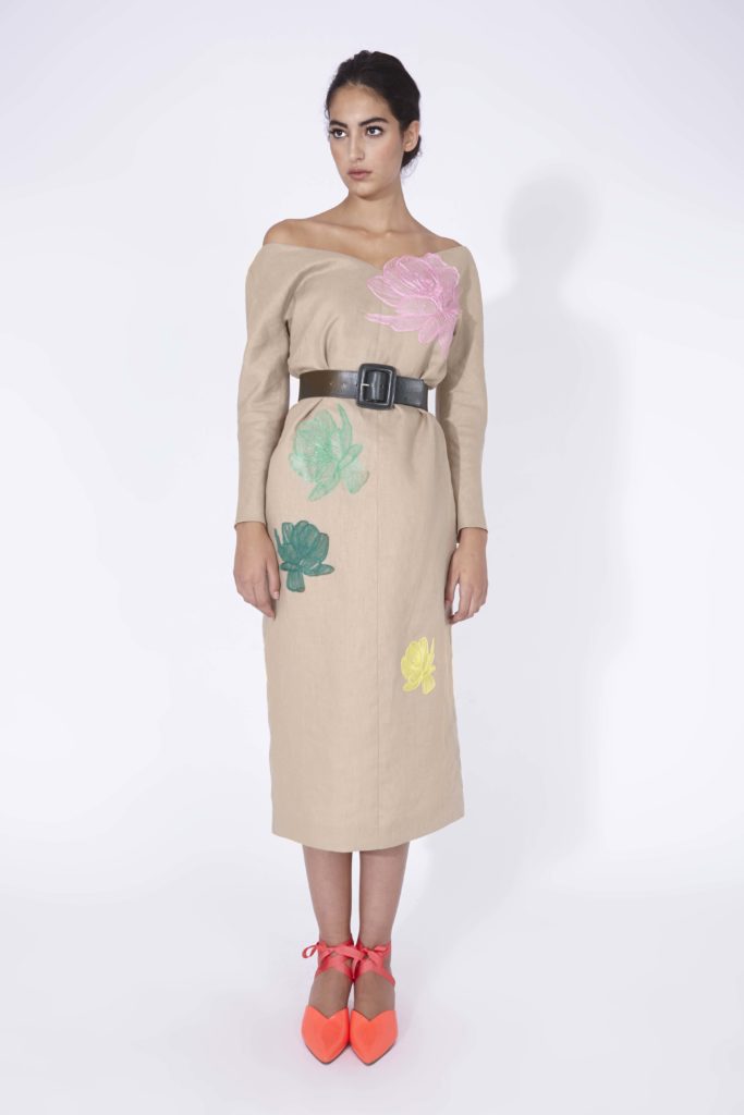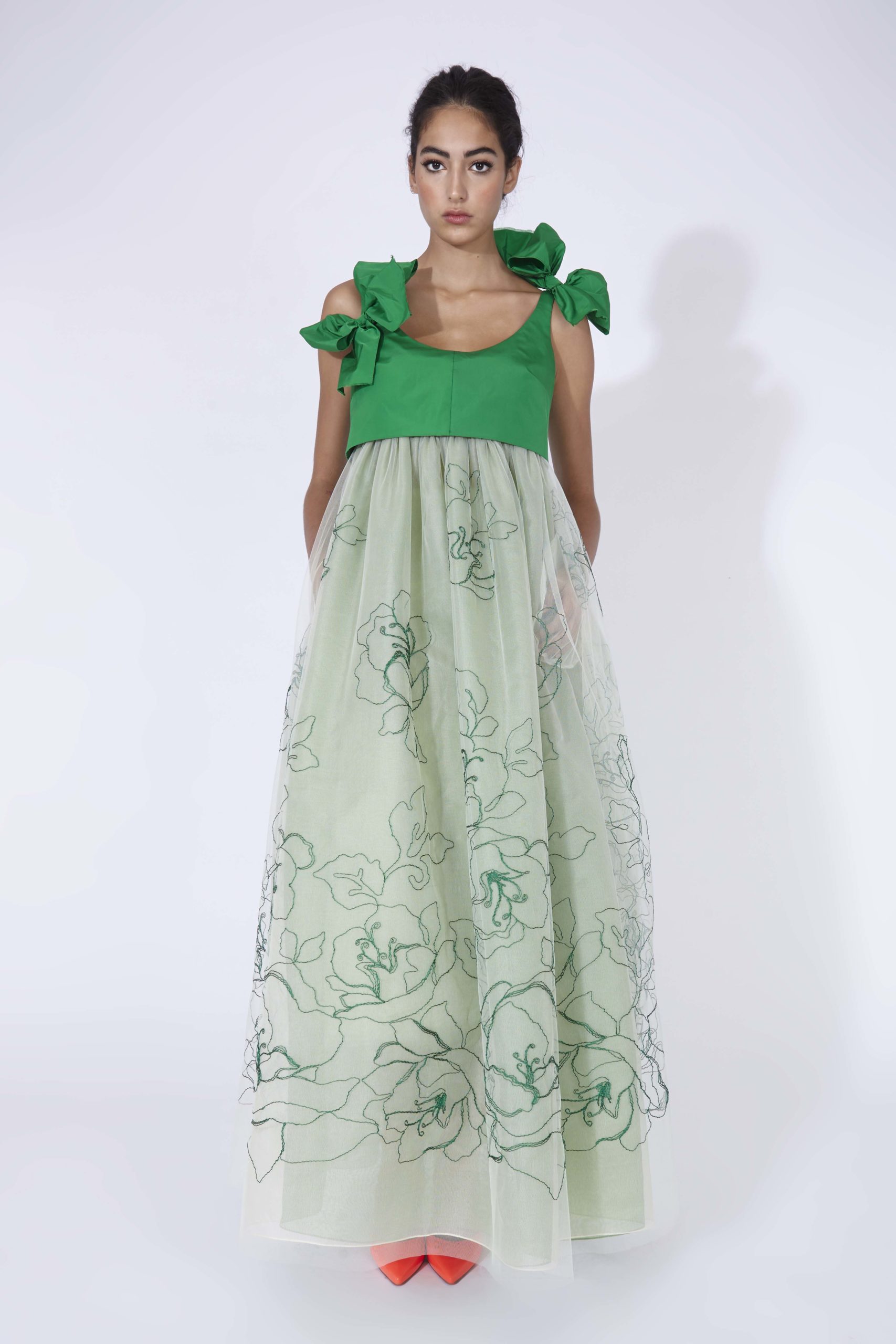 El hilo conductor de la colección viene de la mano de la interpretación de esta figura floral. Destacar como elementos más representativos las importantes magnolias multicolor en encaje, aplicadas a mano sobre diferentes tejidos de la colección, pintadas de forma artesanal, o bordadas en tul con marcados trazos que simulan la silueta de la flor.
