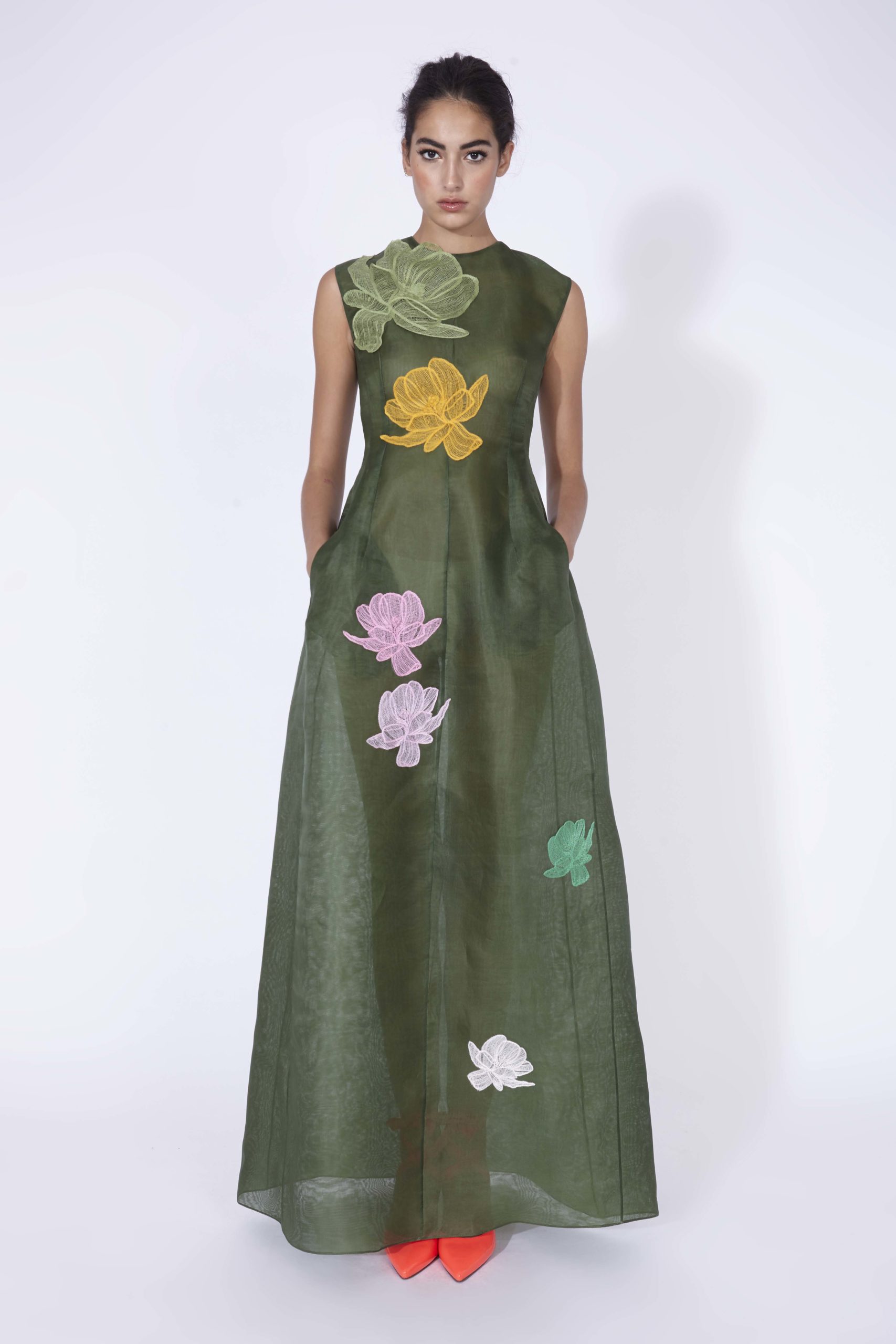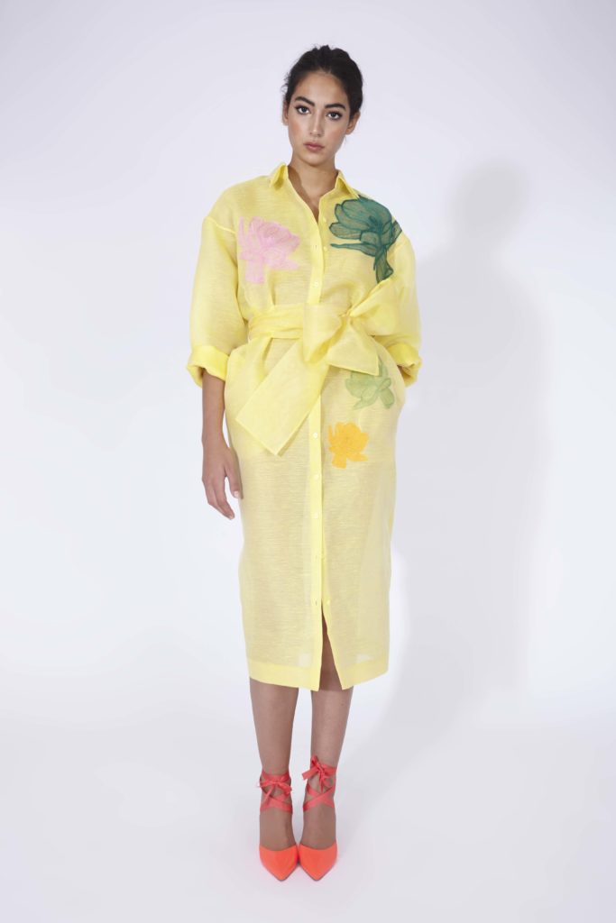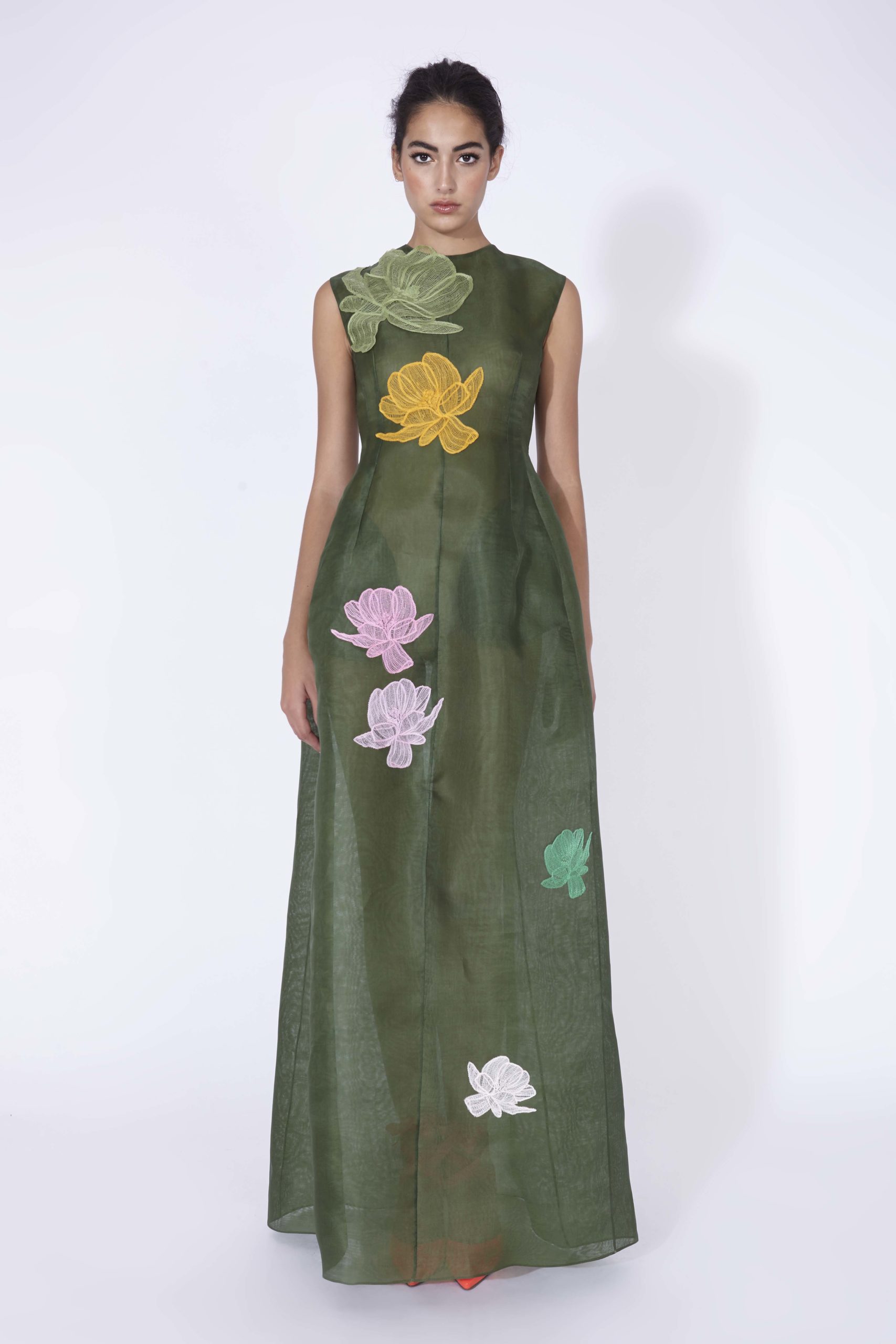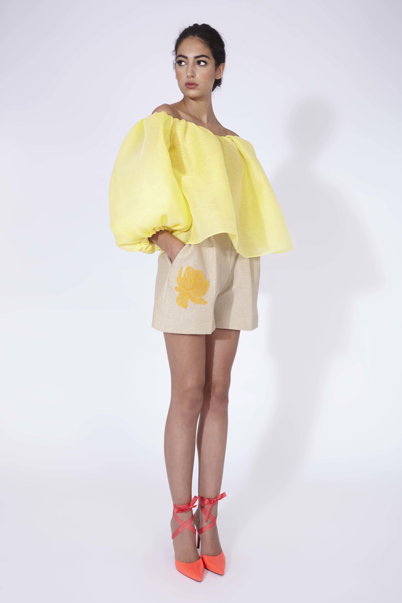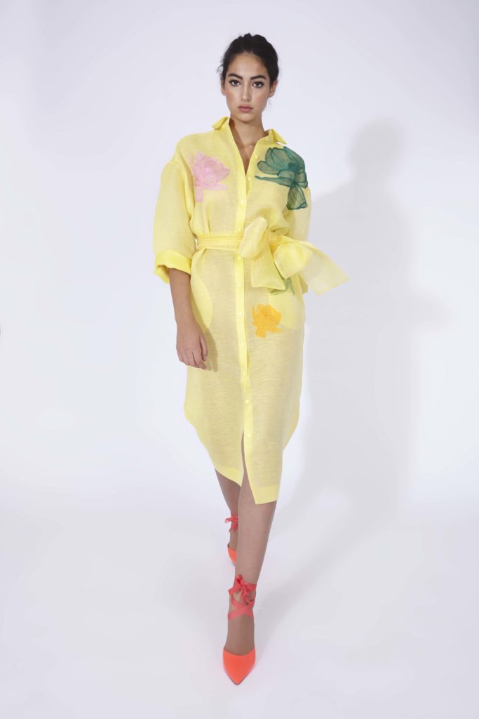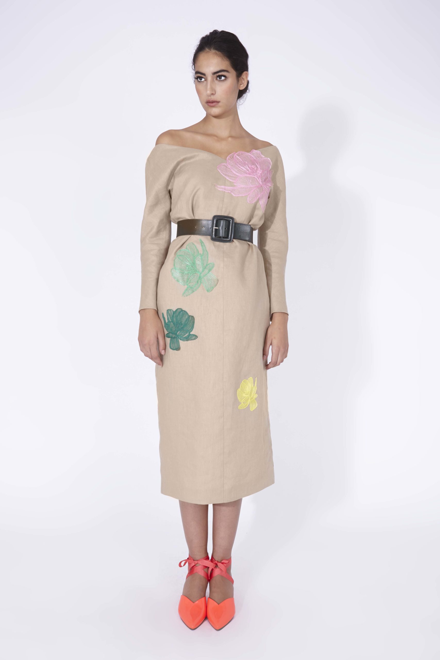 El hilo conductor de la colección viene de la mano de la interpretación de esta figura floral. Destacar como elementos más representativos las importantes magnolias multicolor en encaje, aplicadas a mano sobre diferentes tejidos de la colección, pintadas de forma artesanal, o bordadas en tul con marcados trazos que simulan la silueta de la flor.