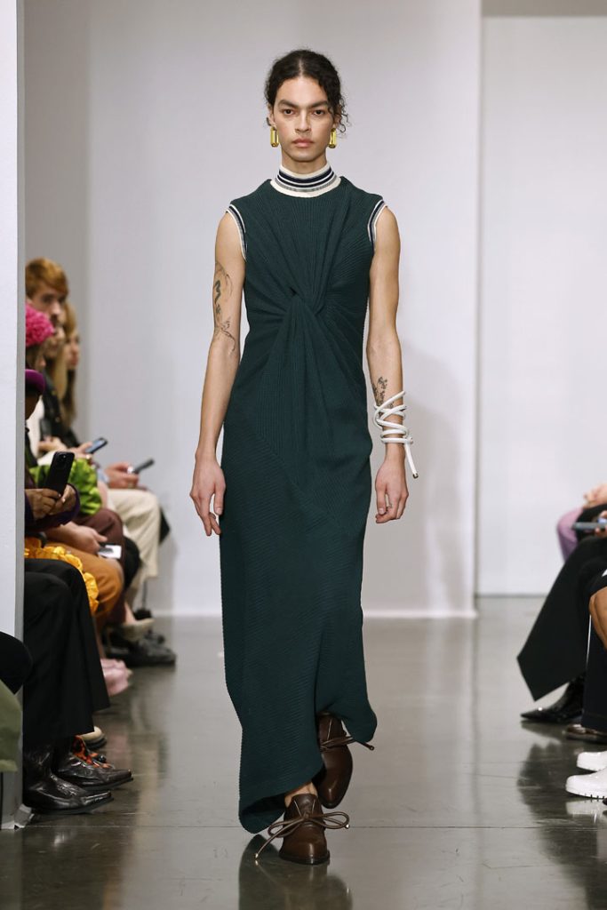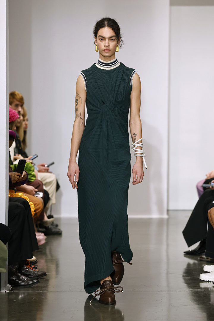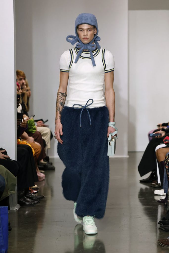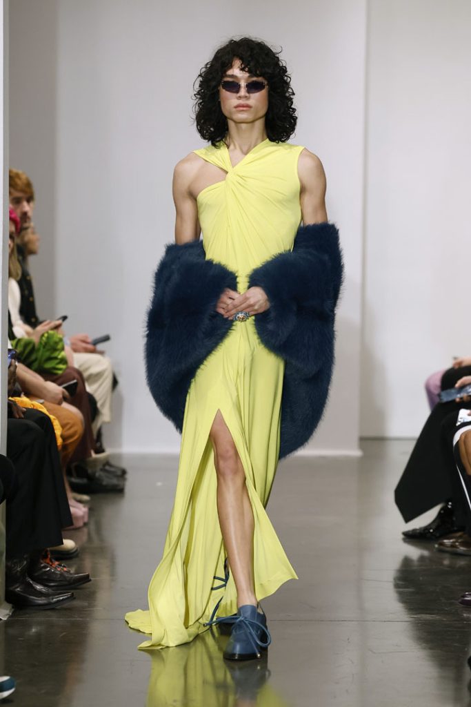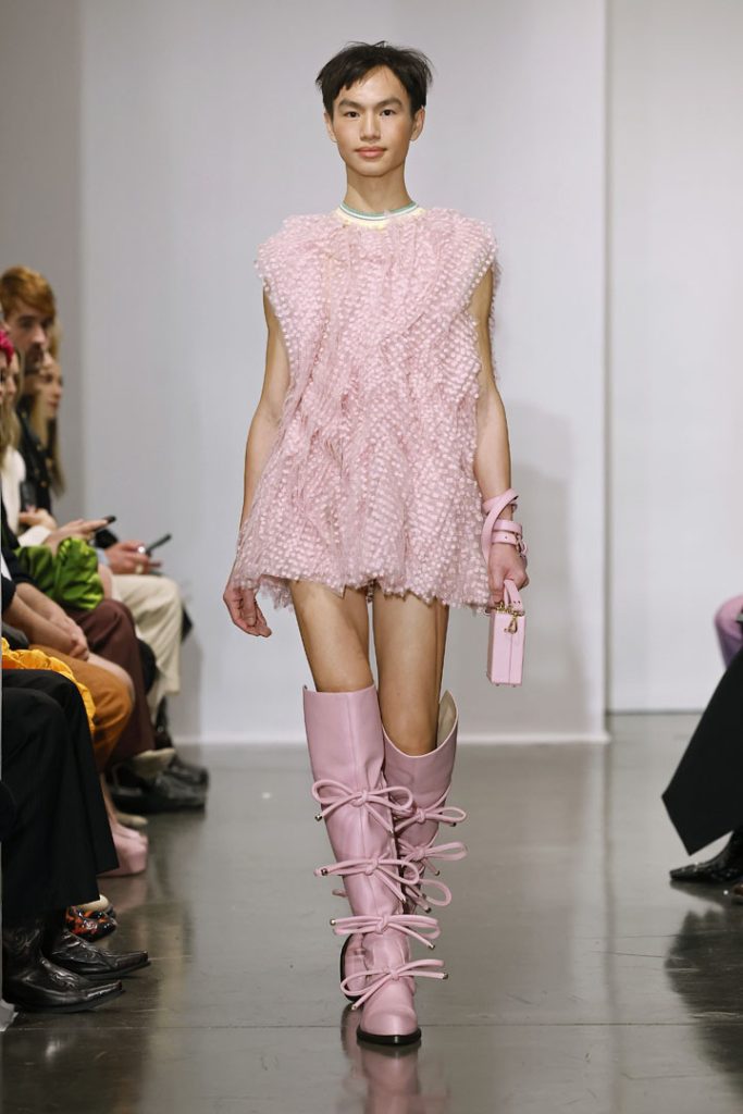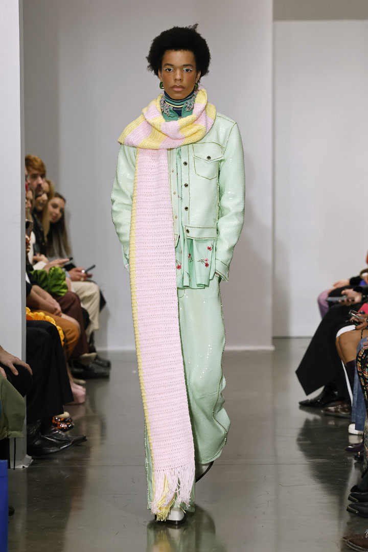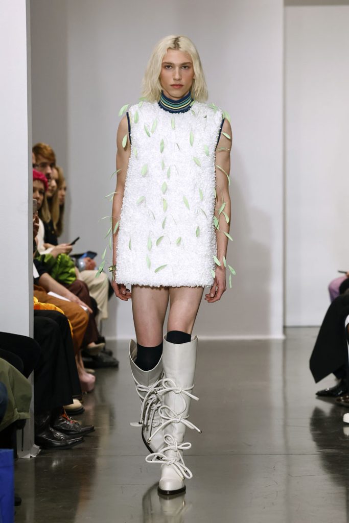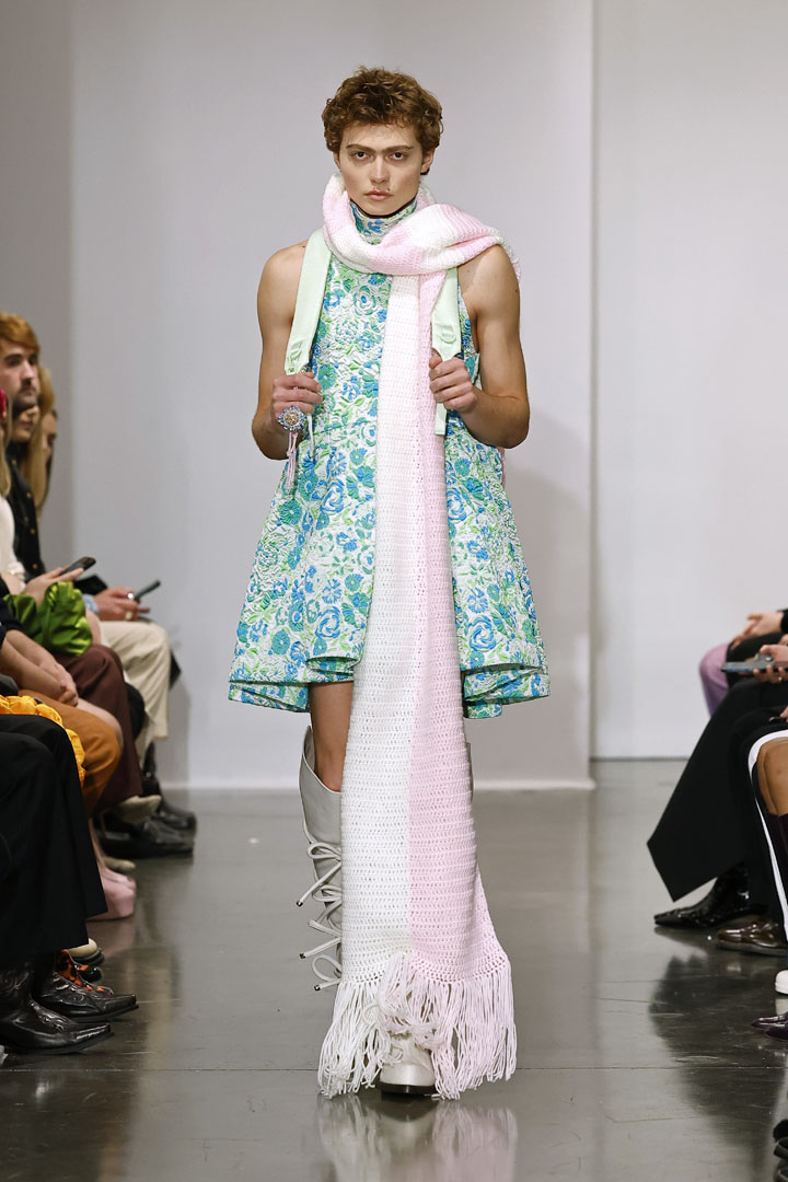 De vivos colores que nos trasladan a un Alicia en el País de las Maravillas gay, un delicado trabajo con los drapeados en tops y largos vestidos que el estilismo a cargo de Alicia Padrón se combina con finas camisetas de mesh, blusas confeccionadas con vortexs de telas en print florales, bufandas en un knit con reminiscencias rústicas y minifaldas de pelo (artificial) que alargan la figura del modelo aportando un nuevo soplo (aún más) fashionista a la propuesta del diseñador.