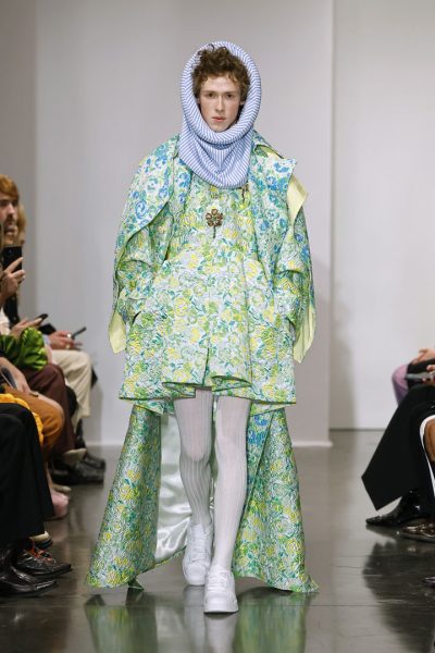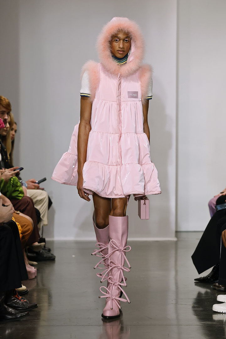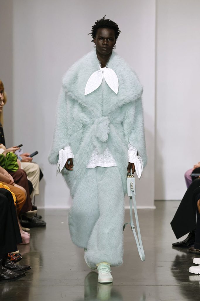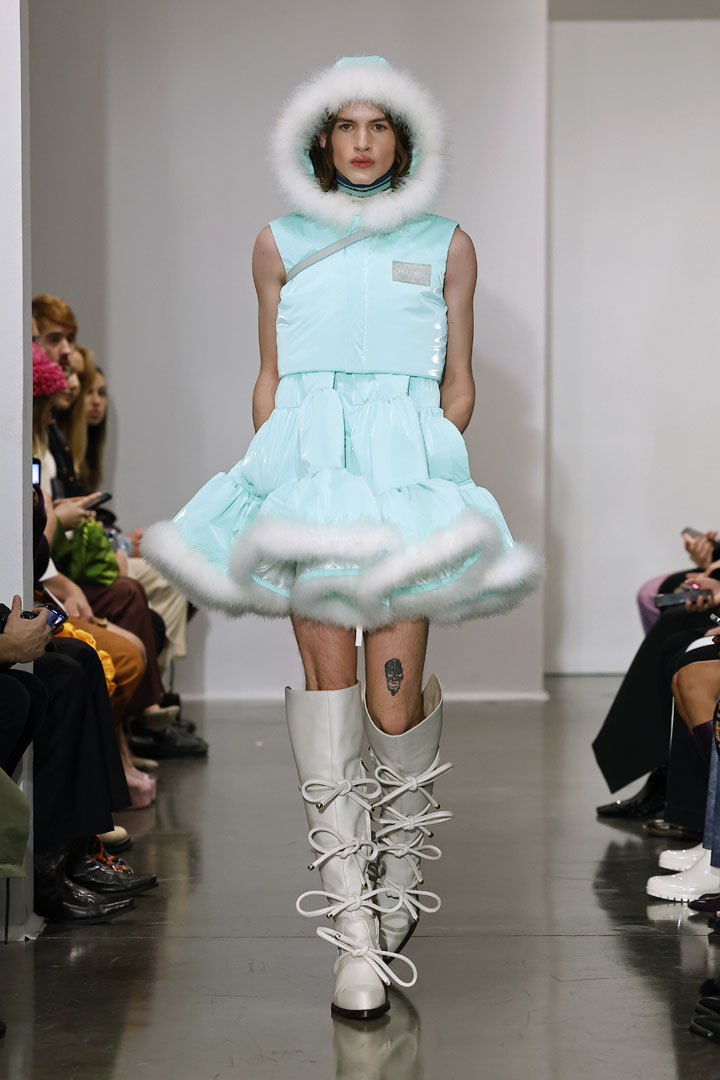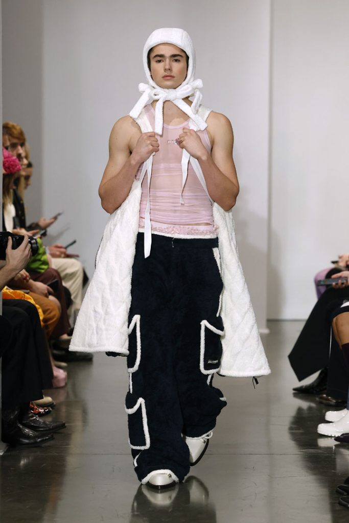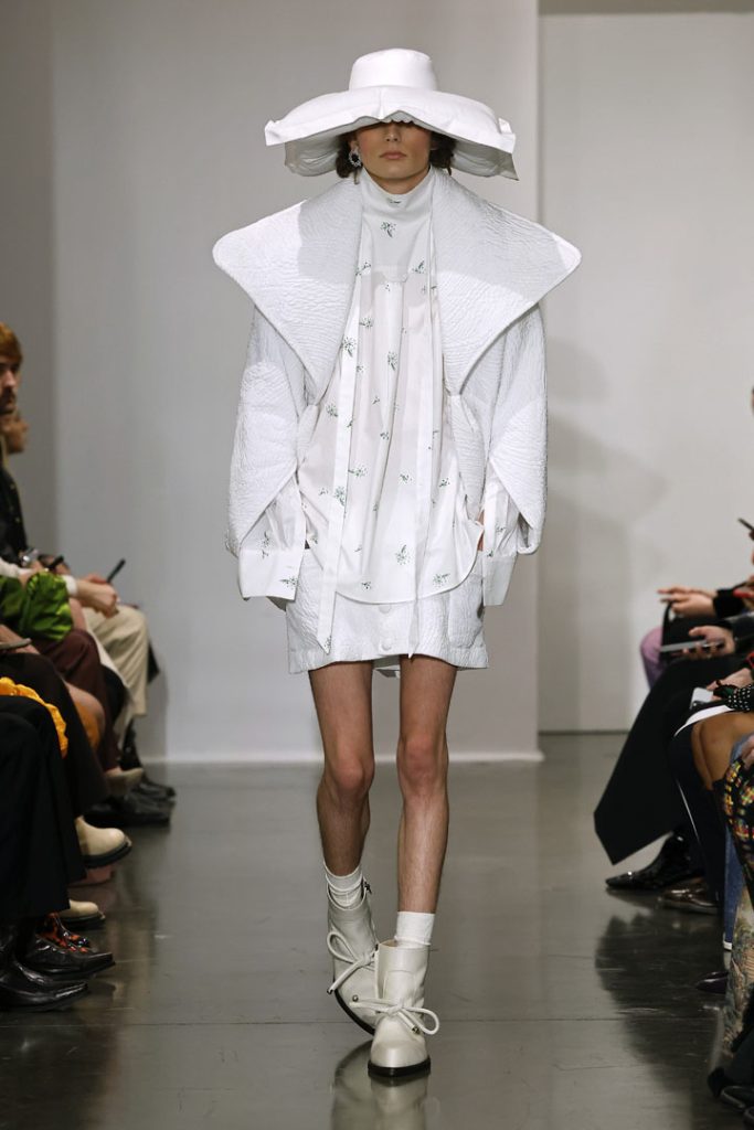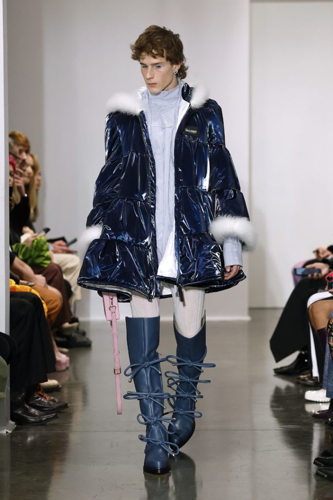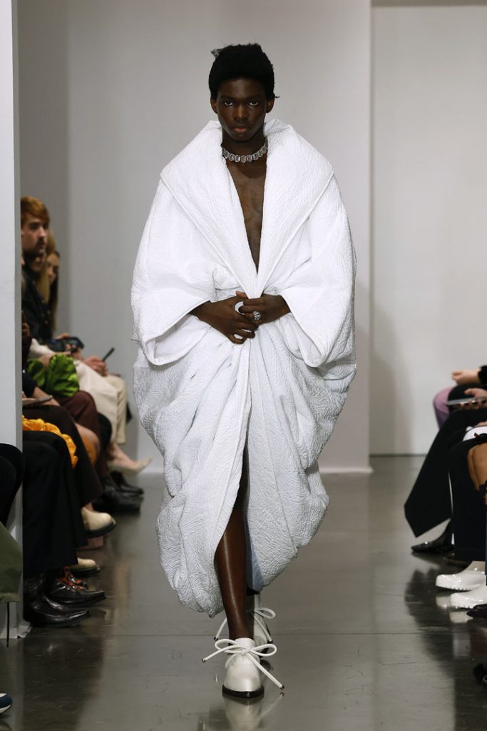 El dramatismo y la grandilocuencia estética que caracteriza el trabajo del diseñador, presente en voluminosas piezas en forma de abrigos que recuerdan a cocoons creados a partir del edredón de la casa de un muy joven creativo, conviven con piezas más sencillas que corresponden al ejercicio más street de la casa.