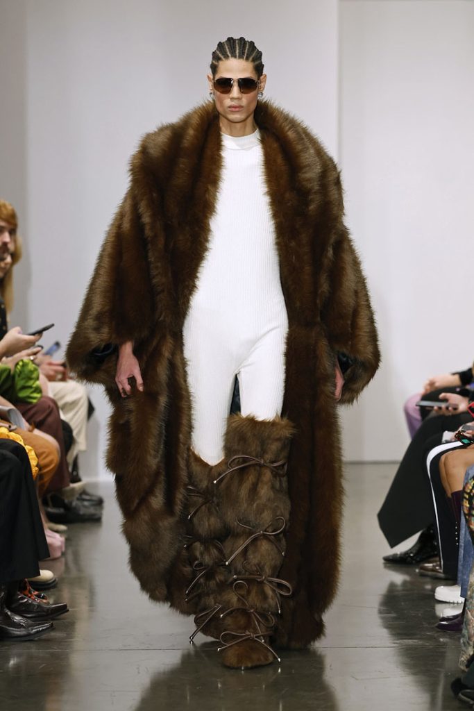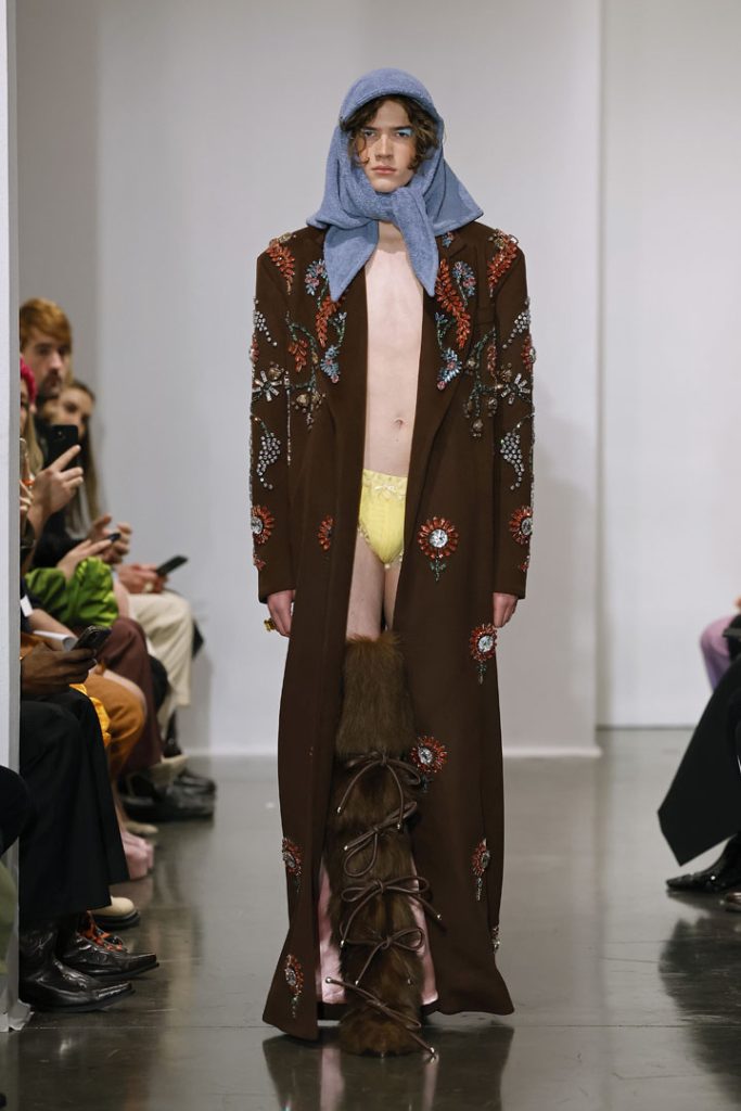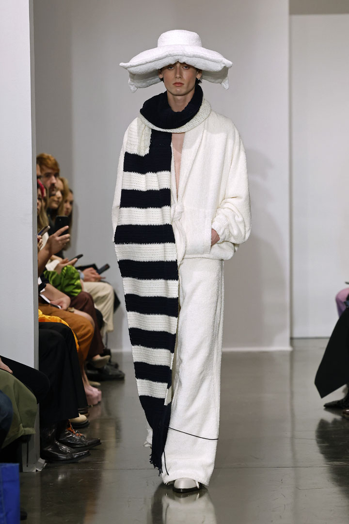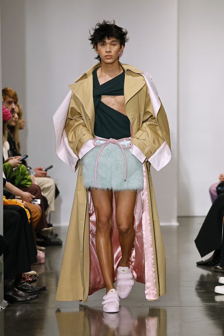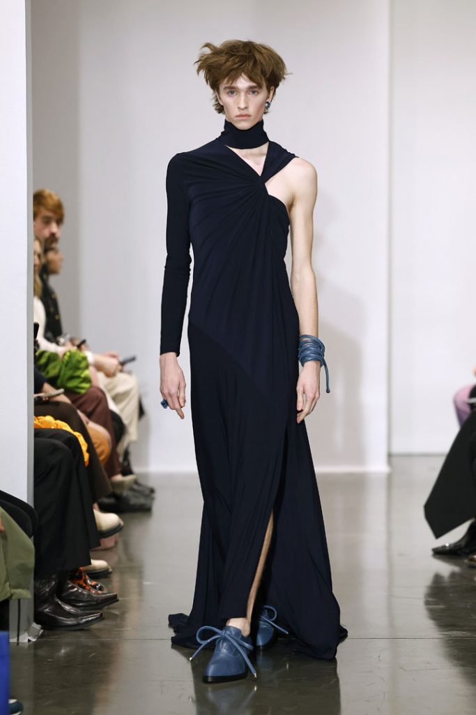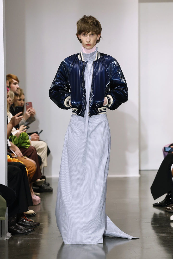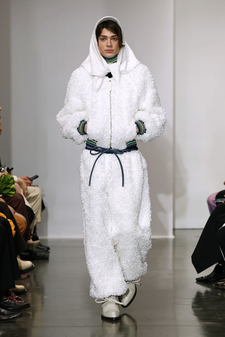 El dramatismo y la grandilocuencia estética que caracteriza el trabajo del diseñador, presente en voluminosas piezas en forma de abrigos que recuerdan a cocoons creados a partir del edredón de la casa de un muy joven creativo, conviven con piezas más sencillas que corresponden al ejercicio más street de la casa.